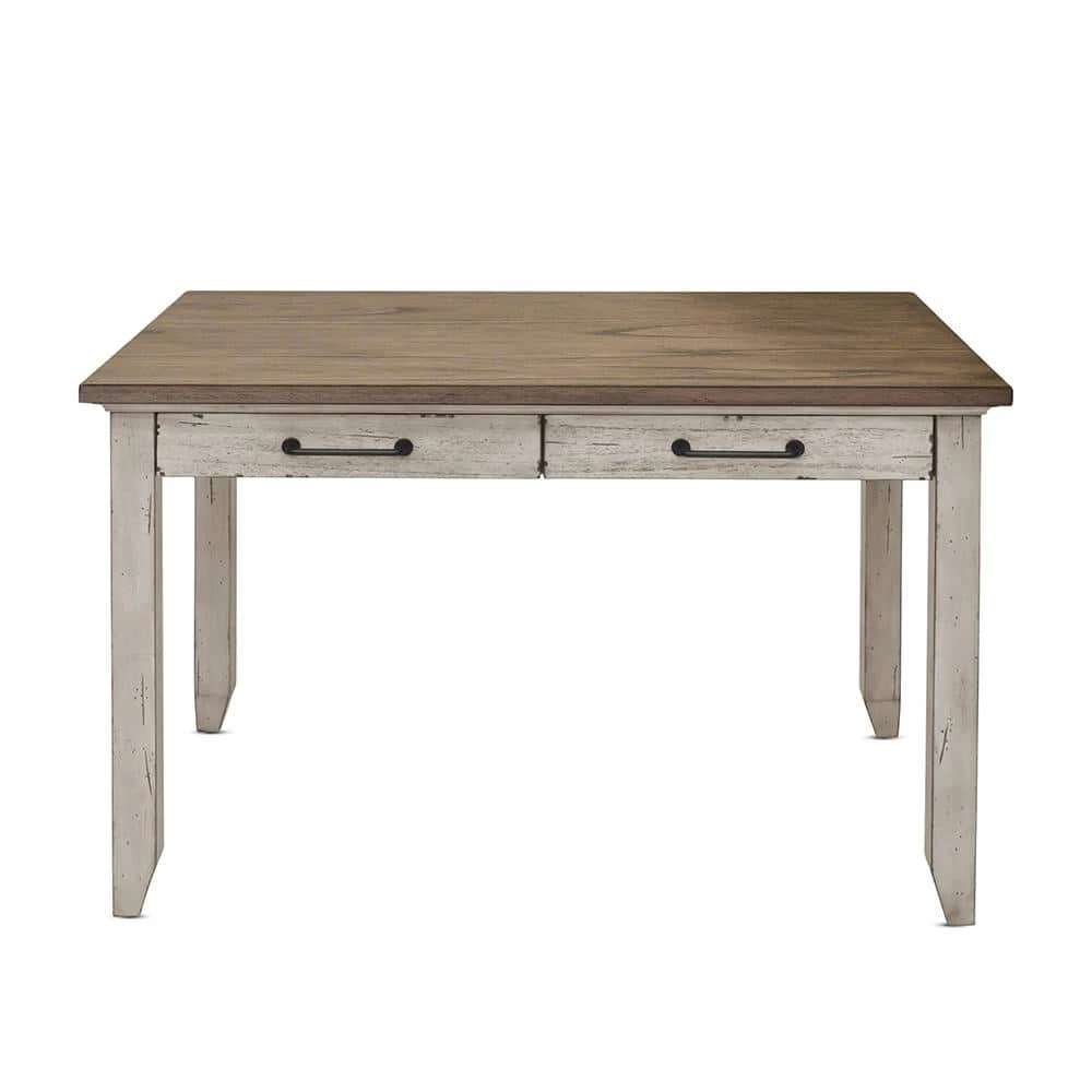 Perfect for your farmhouse inspired home, Bear Creek tables offer just the right mix of casual and rustic inspired designs to blend with today’s decorating environments. Finished in rustic ivory with a honey finished top, this multifunctional table features heavy distressing and rub through for a rustic casual look that will enhance any style. Tapered legs and two drawers with antique pewter drawer pulls for convenient storage. Use this table as a writing desk, console table, or even in the kitchen for added storage!