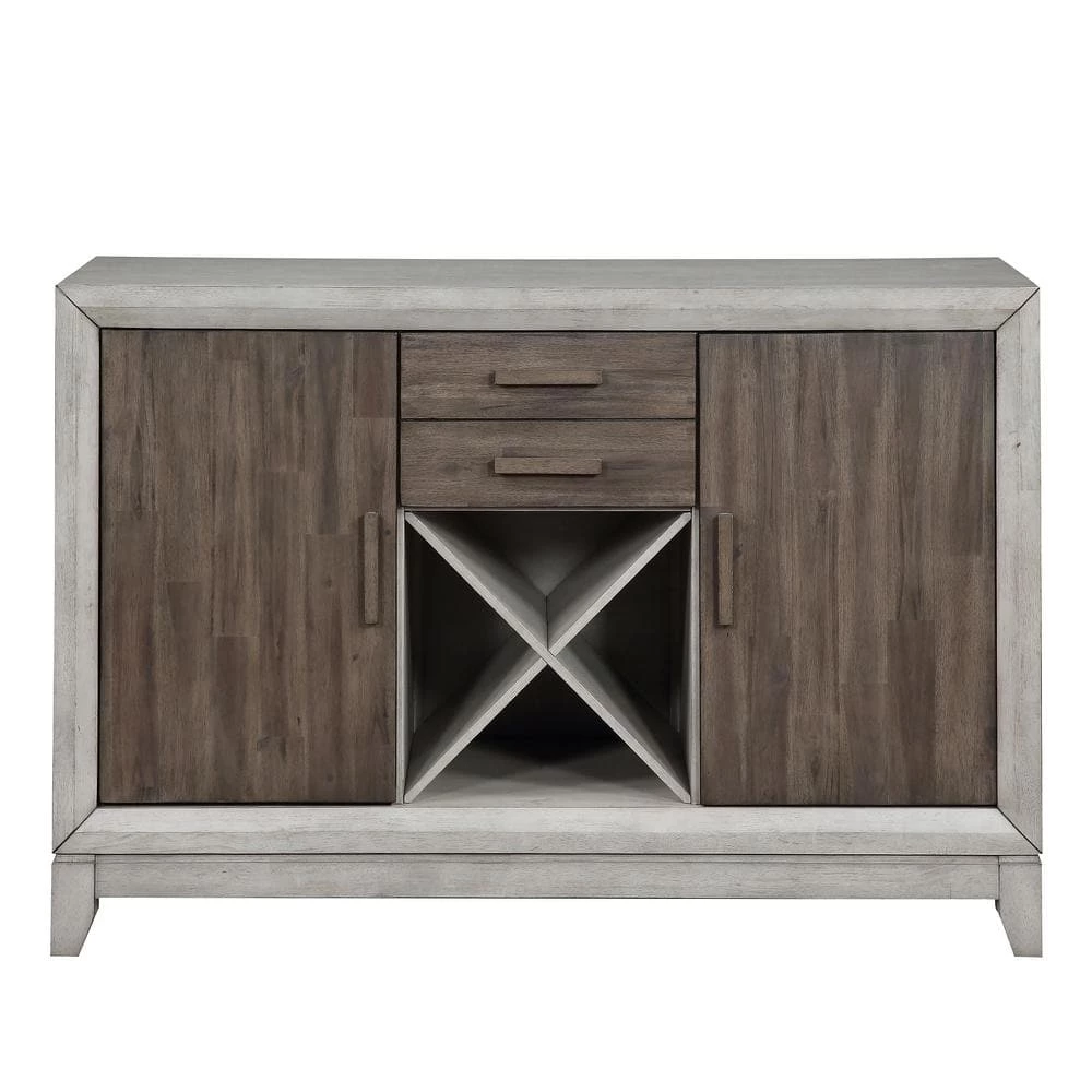 The Abacus 54 in. Server is built for todays lifestyle with a beautiful smoky alabaster and smoky honey finish Two drawers and two doors offer space for hidden storage and the removable center wine rack offers a great solution for bottle storage or as a display area. The transitional style works well with farmhouse, contemporary or transitional styles and the neutral finish complements many interiors. Your purchase includes one server.