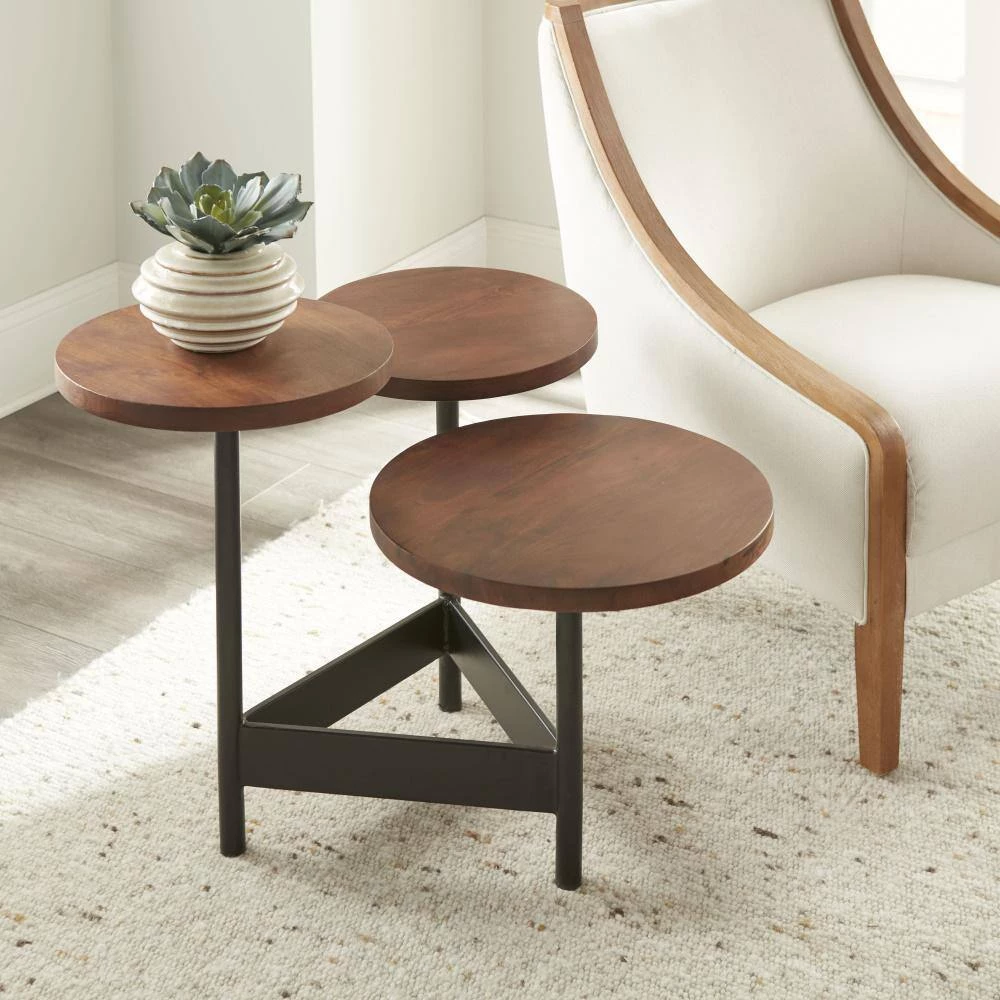 Add dimension to your living space with the Agra multi-platform Side Table. This mixed media table features a black metal cylindrical base topped with 3-solid wood multi-height round tops. that work great for display as well as creating visual interest in a room.