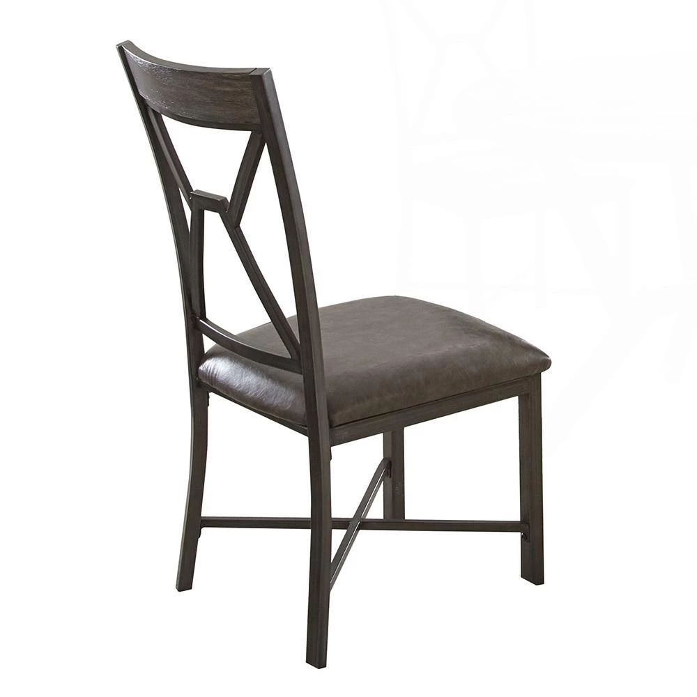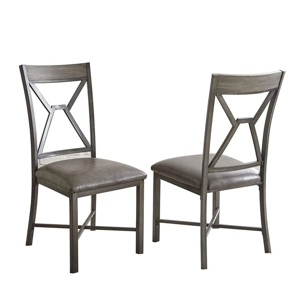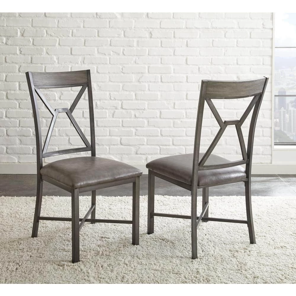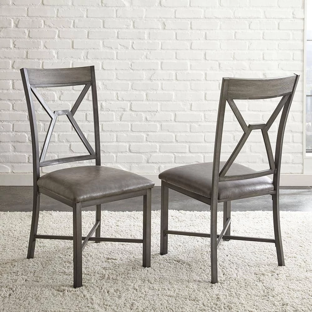 Mixed media and geometric designs combine in a soft gray palette for the Alamo Dining Collection. The Alamo Dining Chairs feature a grey metal finish with black hand brush accents with padded grey vinyl seat and a wooden cap rail with a unique geometric metal back design. X stretchers not only add a design element but strength and stability to the chairs as well. Also available is the matching Alamo dining table (purchase separately). Your purchase includes two dining chairs.