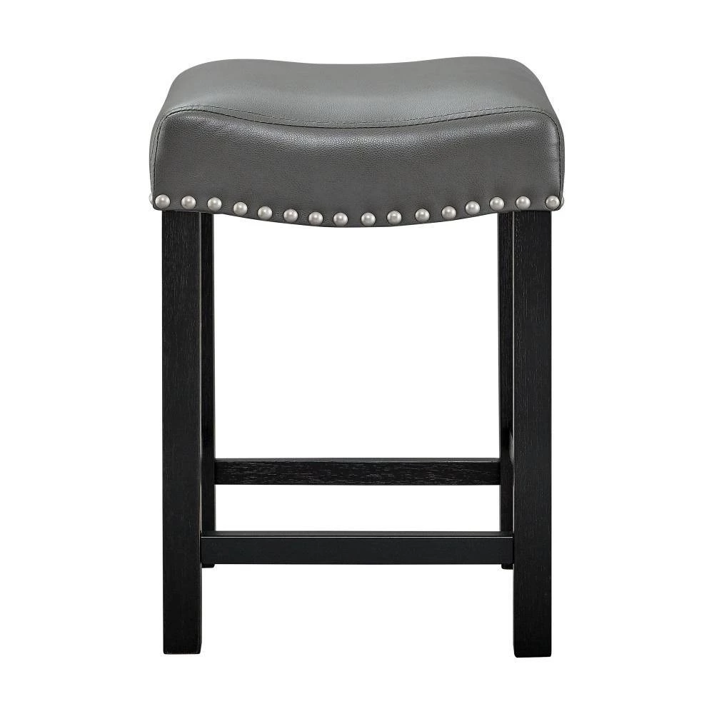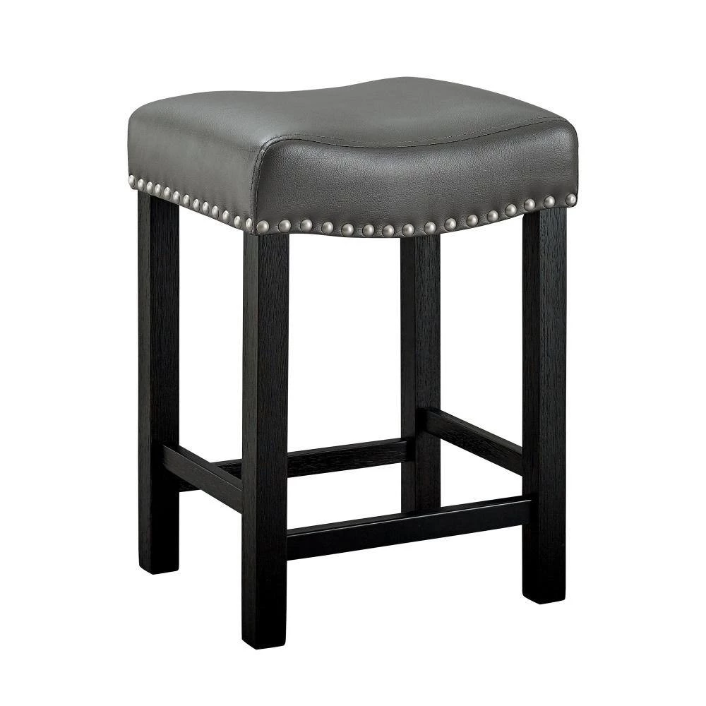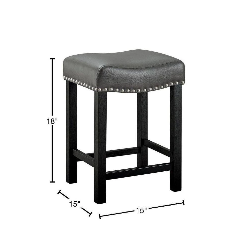 The Aspen Counter Stool is the prime choice for comfortable seating. The comfy contoured saddle seat, in gray faux leather, is easy to clean and contrasts nicely with the ebony wood finish of the solid wood frame. Features include silver nail head accents, adjustable leg levelers and a comfortable foot rail for added stability. Your purchase includes two counter height stools.
