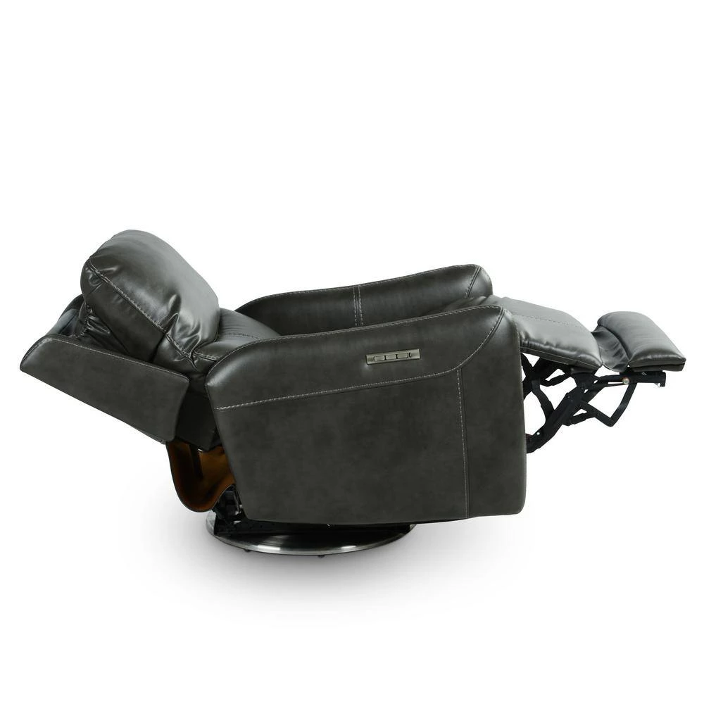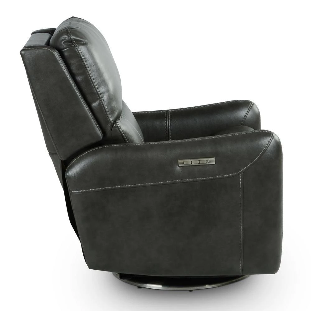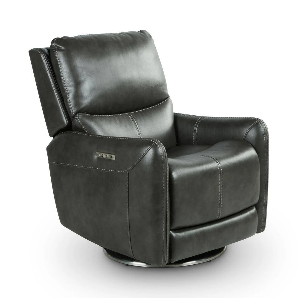 Modern elegance in a triple-power reclining package, Athens combines both style and function. This sleek recliner features pencil arms and power footrest, power headrest and power lumbar all in a chair that swivels 360 degrees. Covered in a durable charcoal faux-leather fabric with baseball stitching, Athens is sure to become your favorite chair. Your purchase includes one power recliner.