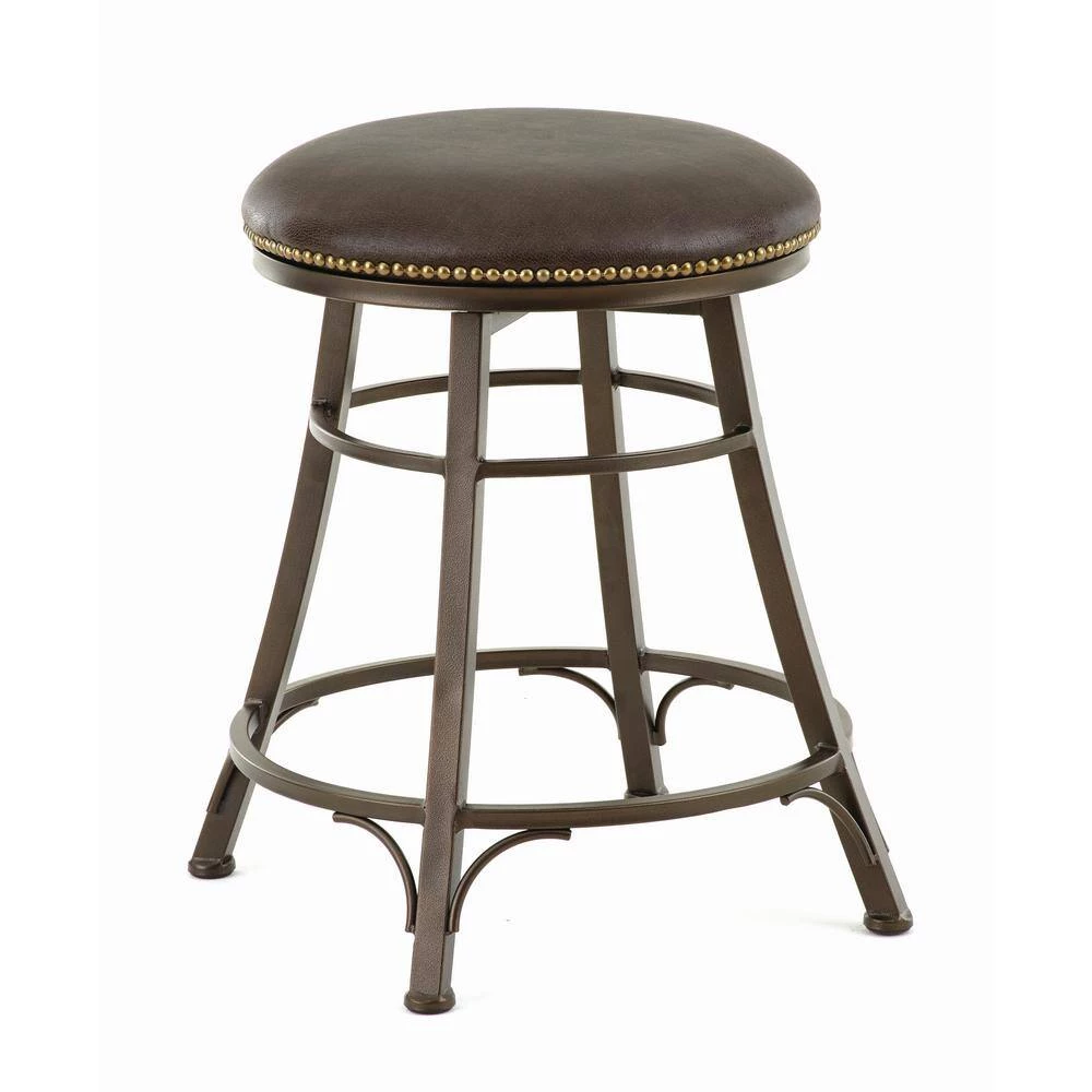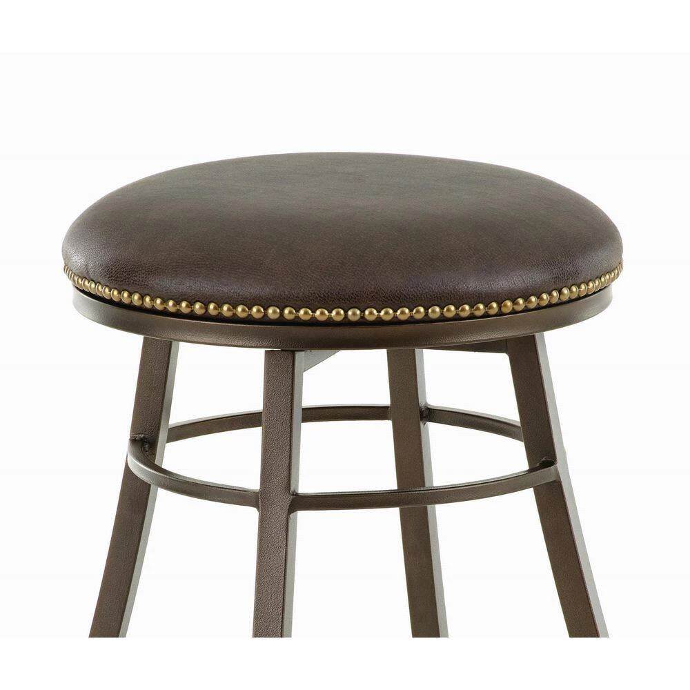 The Bali Backless Swivel Counter Chair offers a heavy duty 360 degree swivel mechanism and is fully welded for added stability. The seat features luxurious bonded leather over a fire retardant foam cushion with nail head trim. The electrostatic metal finish provides scratch resistance and nylon floor protectors keep your floors safe.