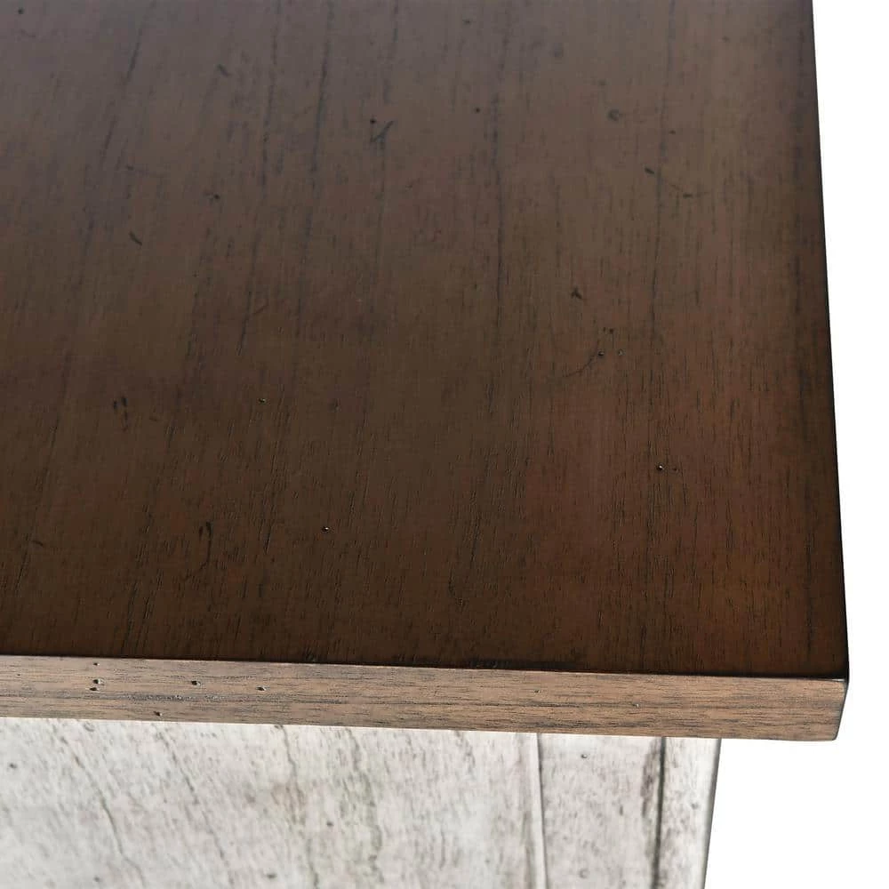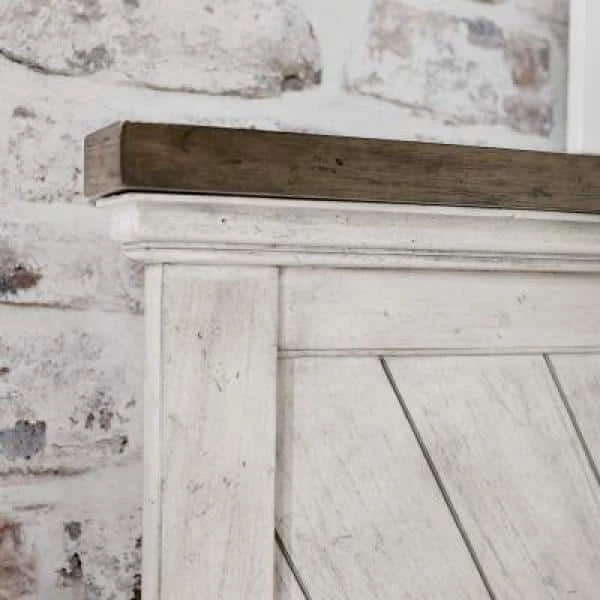 Bear Creek, a rustic, farmhouse-inspired bedroom collection, features an ivory finish that contrasts beautifully with honey-stained tops and cap rails. The Bear Creek Panel Bed features a chevron patterned headboard and footboard topped by a thick cap rail in a contrasting finish. Bed requires the use of both a box spring and mattress (not included). Your purchase includes one headboard, one footboard, side rails and four slats with support legs.