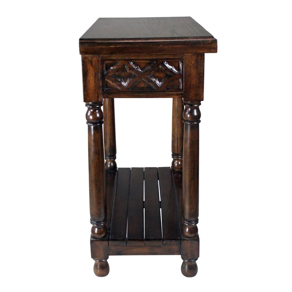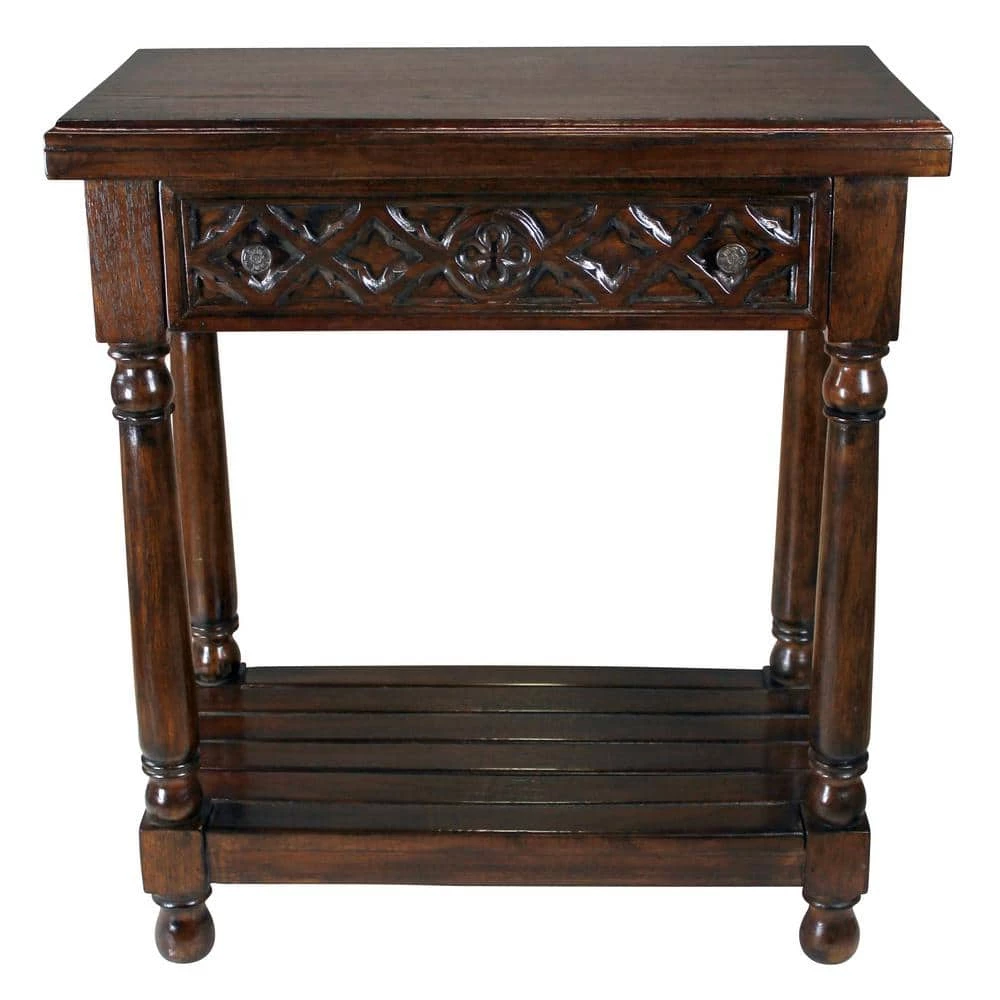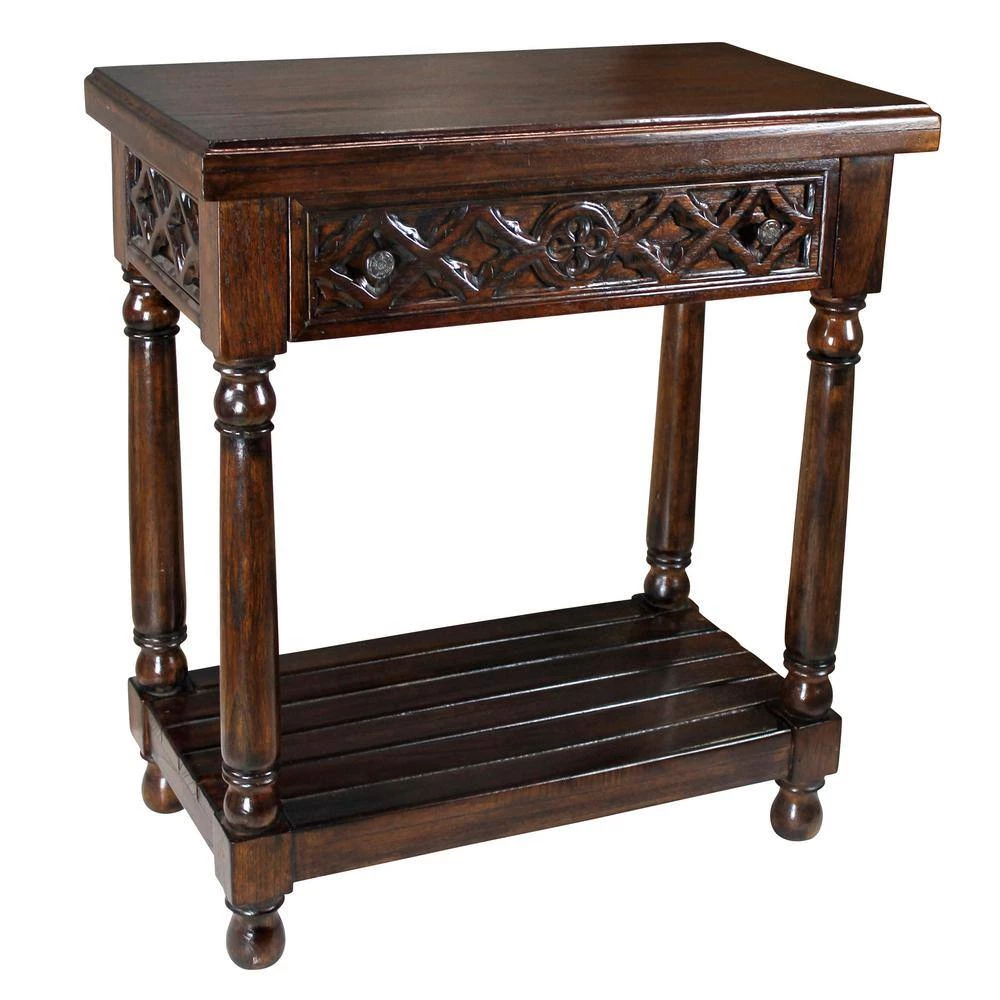 With a pedigree in the Gothic era, this timelessly beautiful replica work of furniture art meshes well with most any antique collection. Hand carved of mahogany, its turned feet and tapered legs rise toward a single drawer with metal pull and a quatrefoil Gothic apron that surrounds the beveled edge of its 2.5 in. foot wide tabletop. Whether you choose our Design Toscano exclusive as living room furniture, enjoy it in the boudoir or put it to work as a dining room serving piece, you’ll appreciate the lavish details added by our skilled artisans. 29.5 in. W x 16 in. D x 33.5 in. H. 40 lbs.