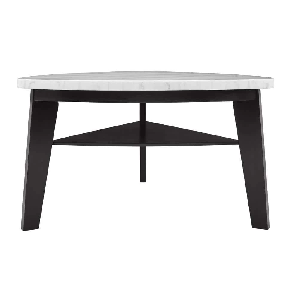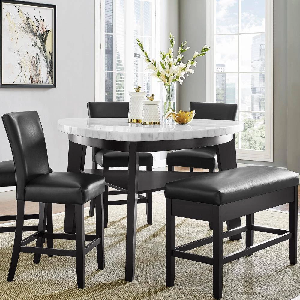 Welcome home elegant stone top dining with Carrara by Steve Silver Company. The ebony base of the Carrara Dining Table pairs beautifully with the white marble top in a unique soft triangular shape that is visually alluring and practical for dining, conversation or work. The under top shelf adds appeal as well as storage or display space. Table can seat up to 6 with the addition of the Carrara dining chairs and bench (purchased separately). Your purchase includes one counter height dining table.