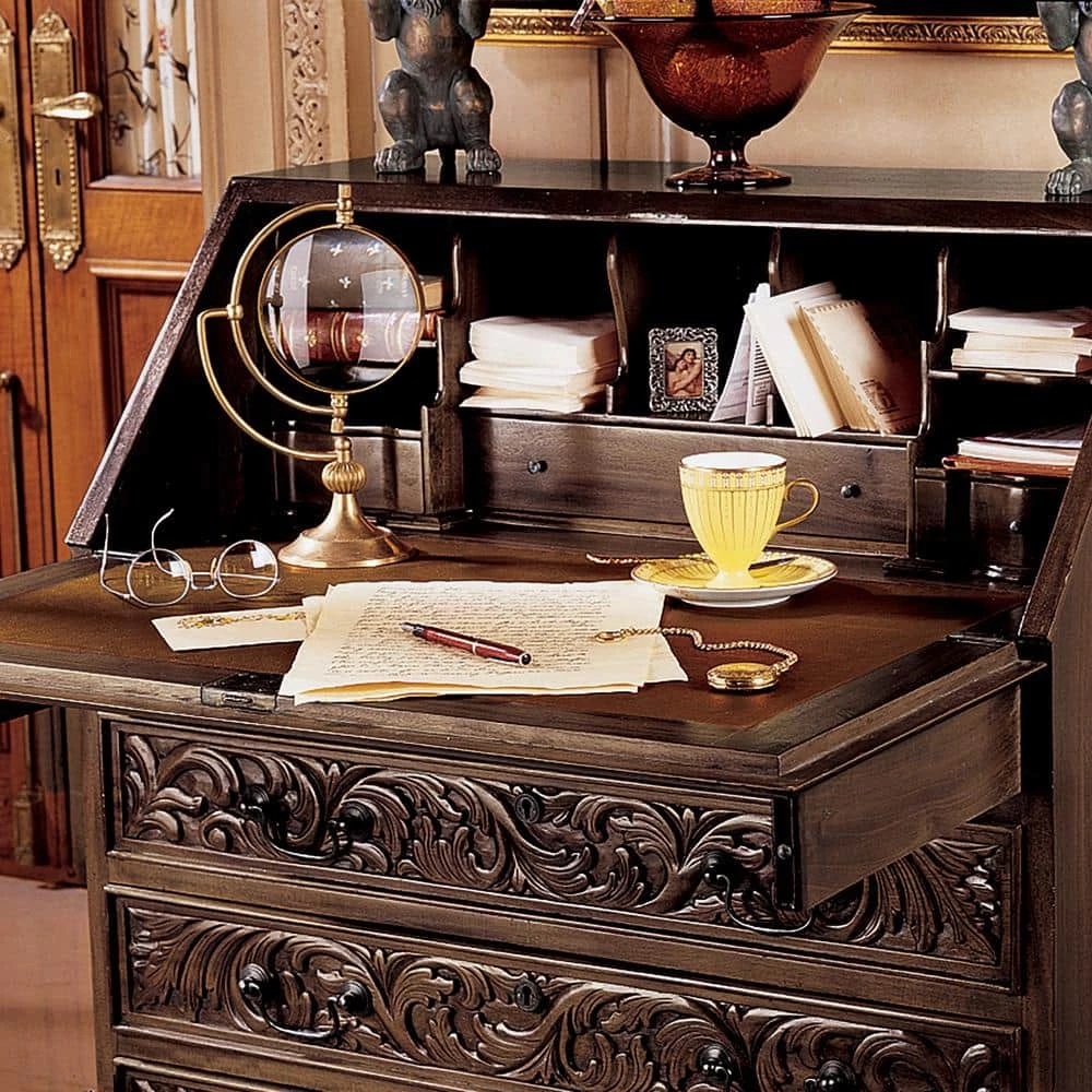 It’s almost a shame to ever lower the intricate mahogany front panel (which takes over a week to carve), of this mid-19th century antique replica except that its leather embossed writing desk with pigeonholes and drawers is so useful. Four exterior locking drawers add to the functionality of this heirloom piece carved with stylized unicorns distressed just enough to replicate an antique. 33 in. W x 30 in. D x 37.5 in. H. 120 lbs.