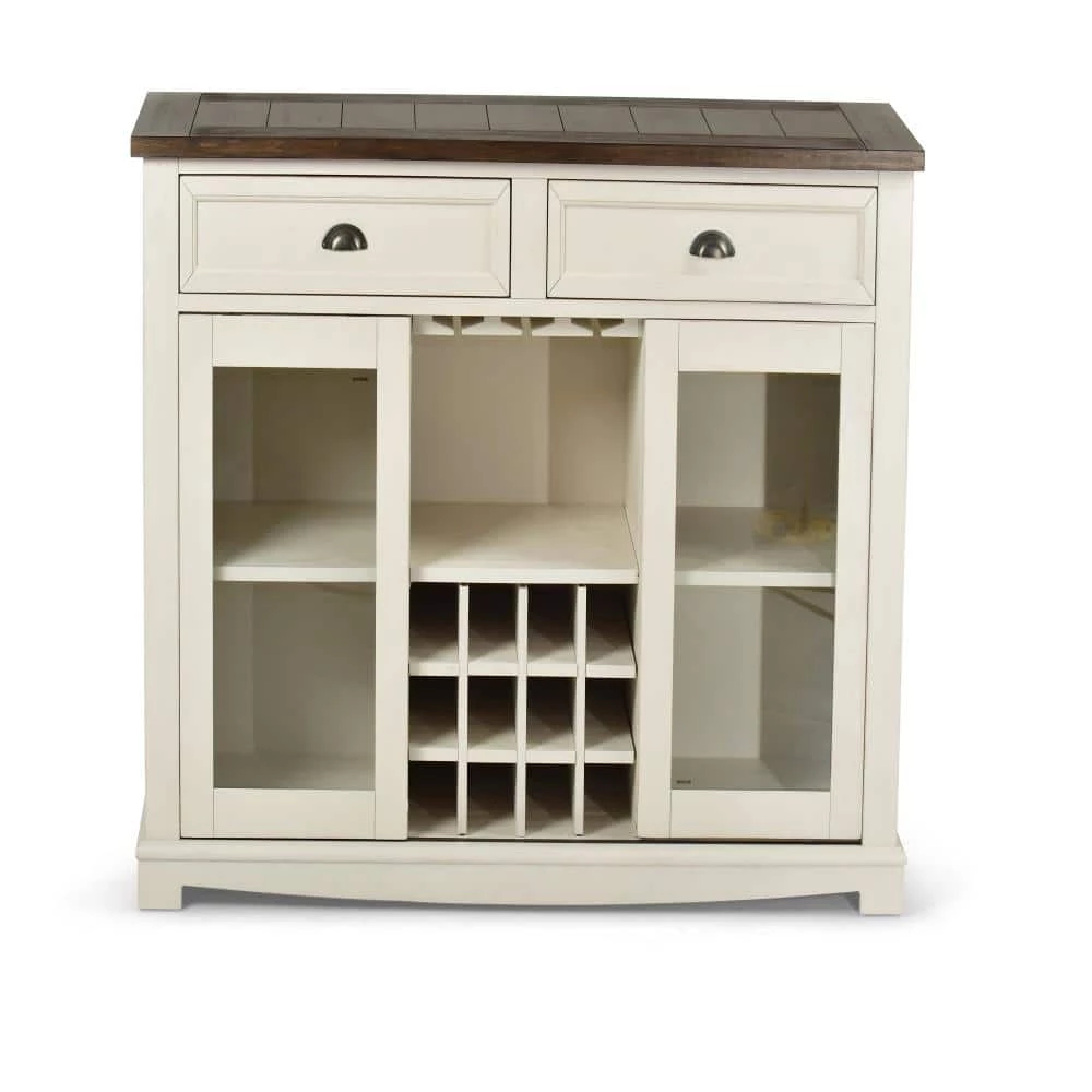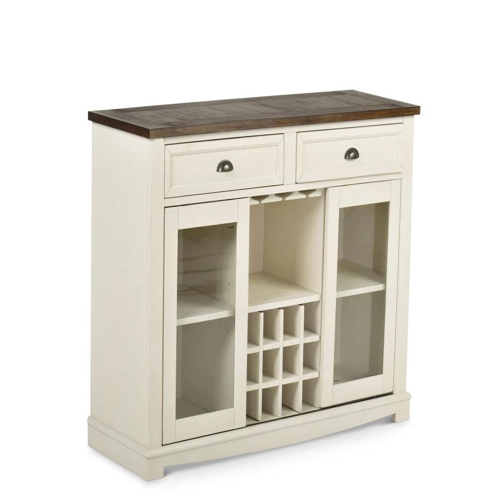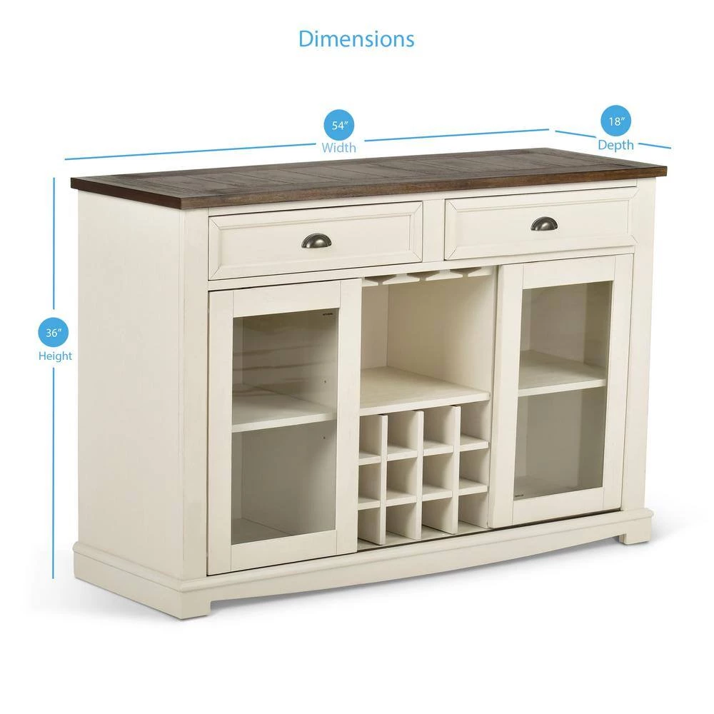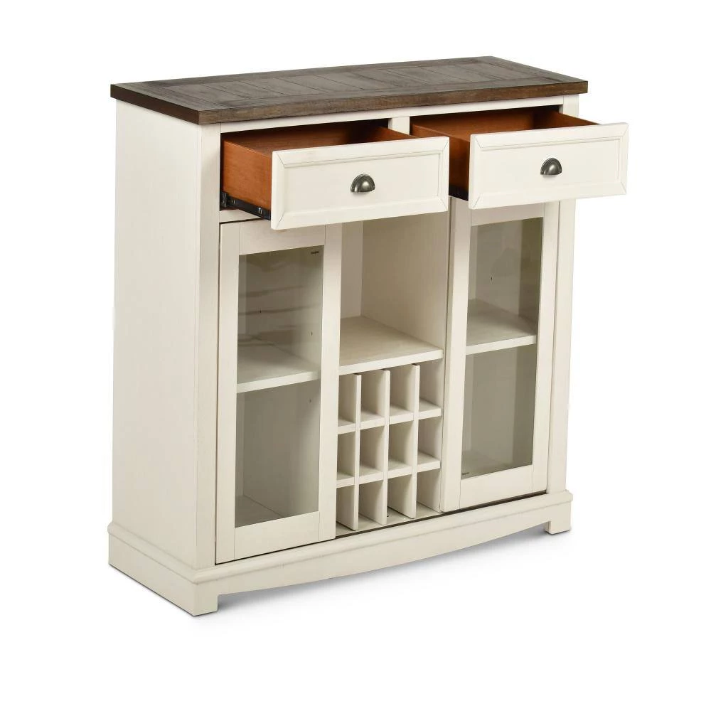 The Cayla Server is finished in a heavily distressed antique white base that highlights the dark oak finish tops. The server offers two felt lined drawers with metal side glides for smooth open and close and feature picture frame molding details and pewter cup pulls. There is additional storage behind the glass pane sliding doors and center storage for wine and stemware.