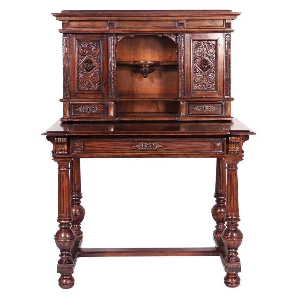 Our early 18th century French antique replica is sized for versatility and boasts a sliding desktop for added writing space. Of handcarved mahogany, it features two shelved cabinets and drawers for storage, flanking a space for display. It’s rich authentic period details take a team to complete this signature piece of furniture art. Ships in 2-pieces. 39 in. W x 26 in. D x 54 in. H. 100 lbs.
