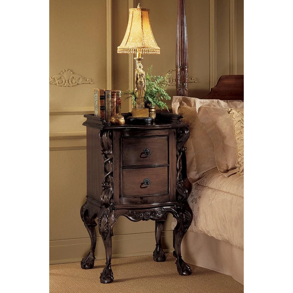 Each time you reach to shut off your bedside lamp, you’ll admire the deeply hand-carved mahogany in this 17th-century French antique replica. Inspired by the Rococo style, from its carved claw-and-ball feet to its ornate uprights, our Toscano exclusive boasts 2-deep drawers and quality metal pulls. This stunning work of furniture art will be enjoyed for generations to come. 21 in. W x 17 in. D x 36 in. H. 45 lbs.