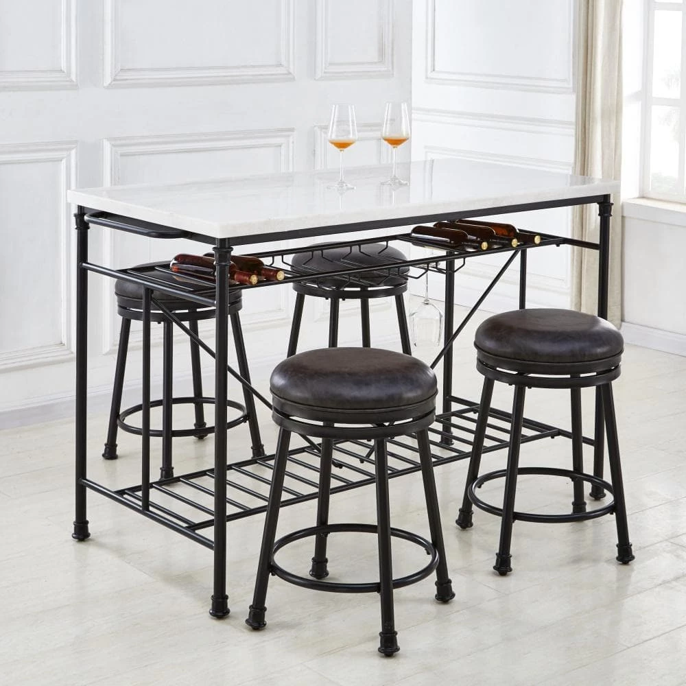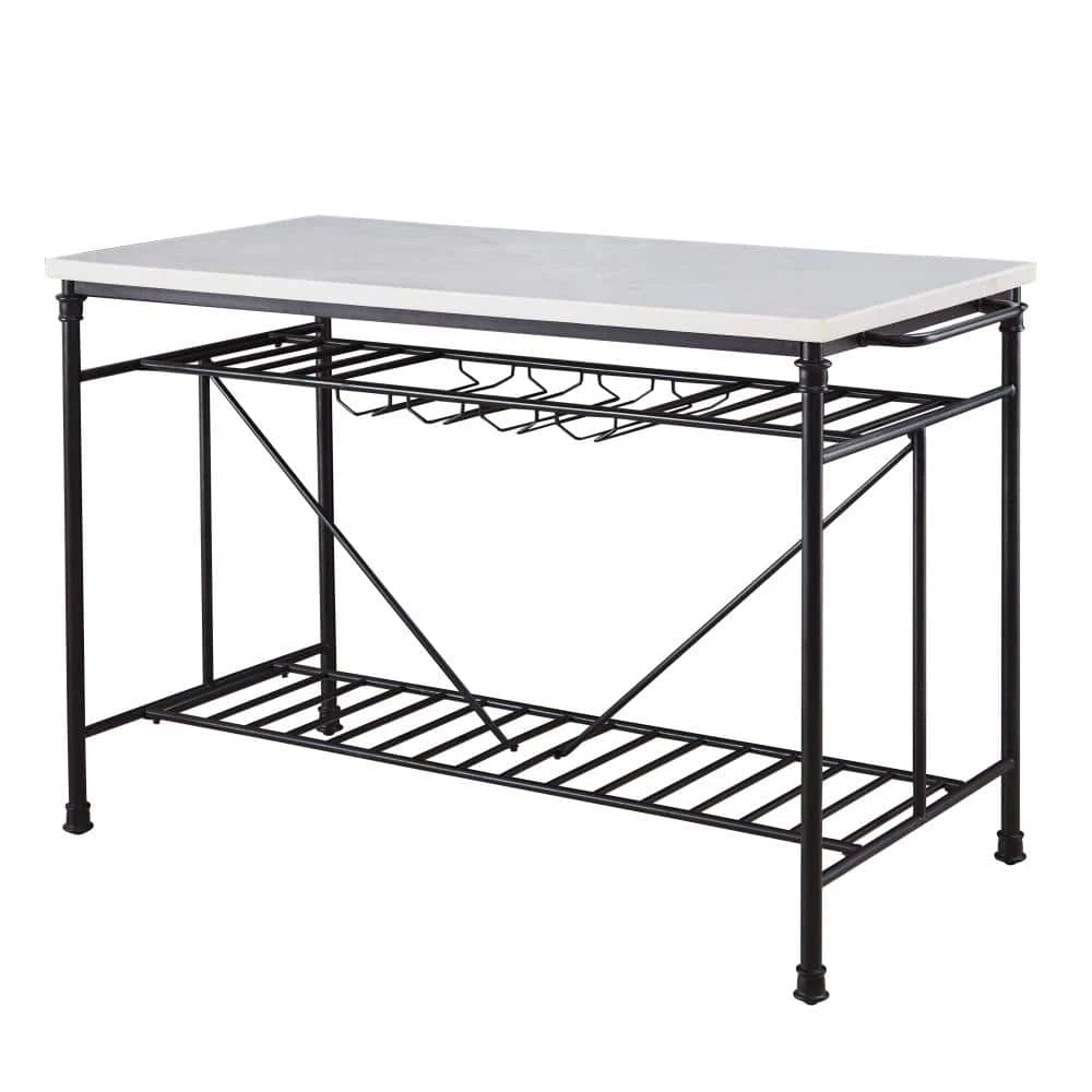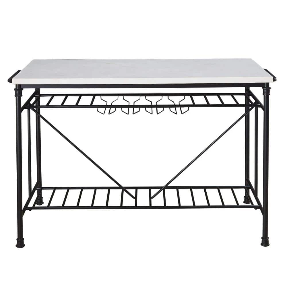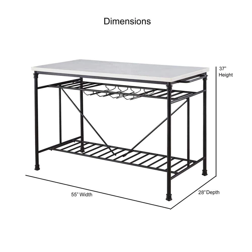 Enjoy the ambiance of your favorite neighborhood cafe with the marble top Claire Kitchen Counter Island from Steve Silver Company. You will marvel at the beauty and functionality of this kitchen island with its seamless white marble top and charming metal base. Towel racks and-bottle storage and hanging stemware add utility to the set. May also use as dining space with the addition of the matching counter height stools (purchased separately). Your purchase includes one kitchen island.