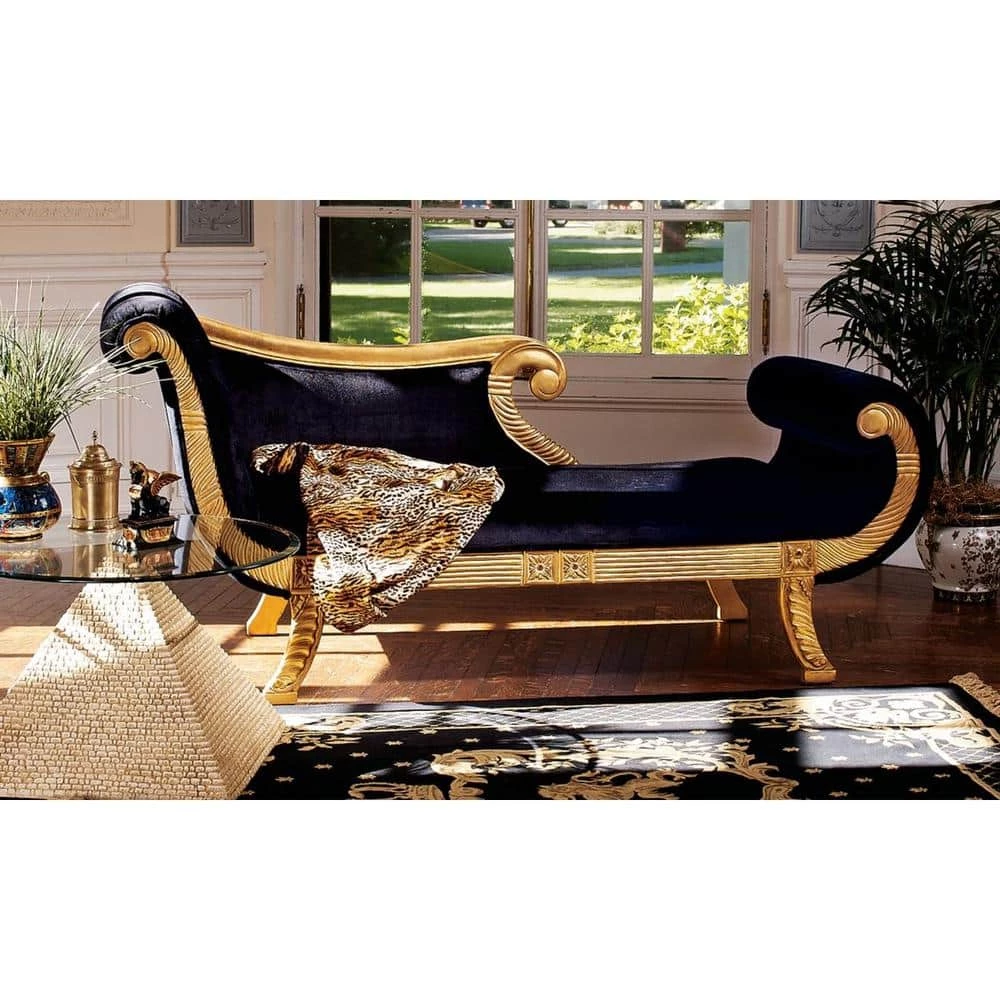 Like the famous ruler herself, our Toscano-exclusive, fit-for-a-queen chaise does a feline stretch in more than six feet of rich ebony fabric upholstery. With deeply hand-carved, scrolled arms and footrest highlighted with gold gilding, this Egyptian Revival work of fine mahogany furniture art boasts the sensuous curves of its fabled namesake and is sure to claim a place of honor among your treasures from around the world. 75″Wx29″Dx36″H. 77 lbs.