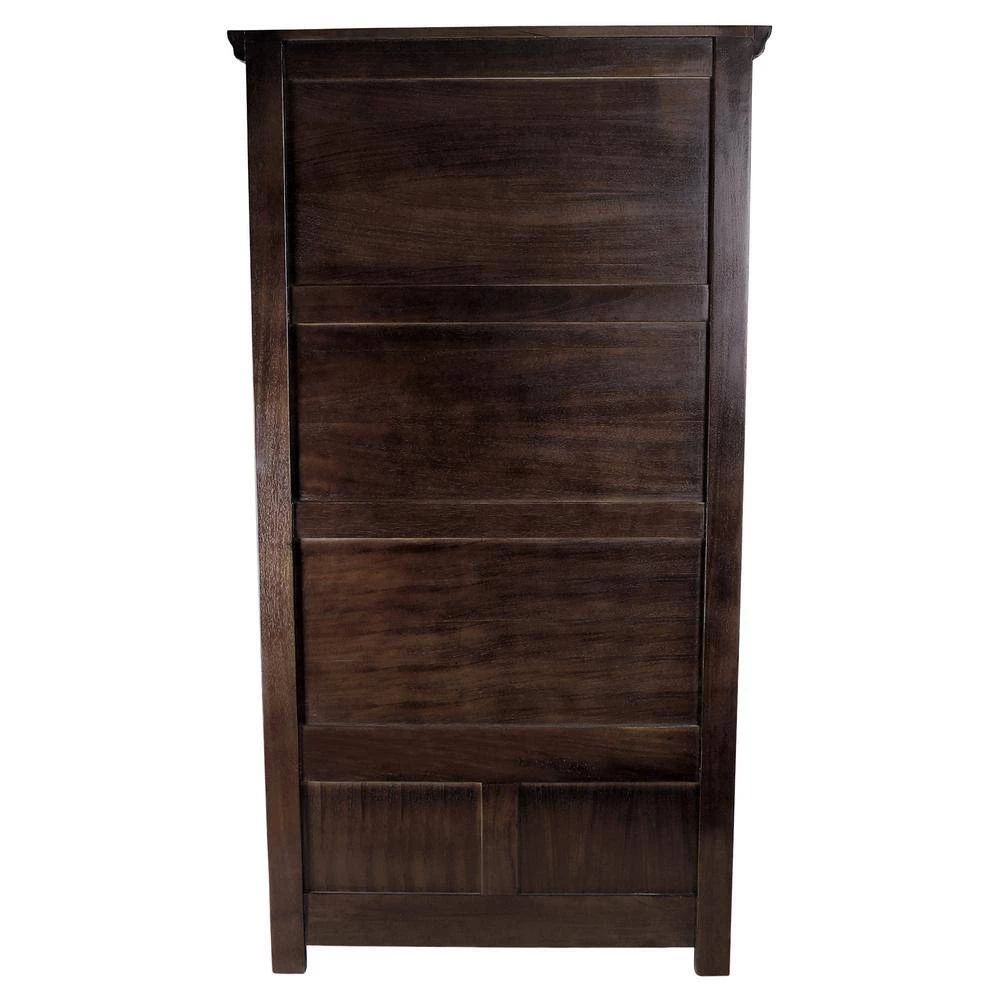 - Craftsmanship of ironwork hinges, lock and key embellish thick doors that open to reveal three shelves and two drawers for storage in quality 5-feet tall masterwork
