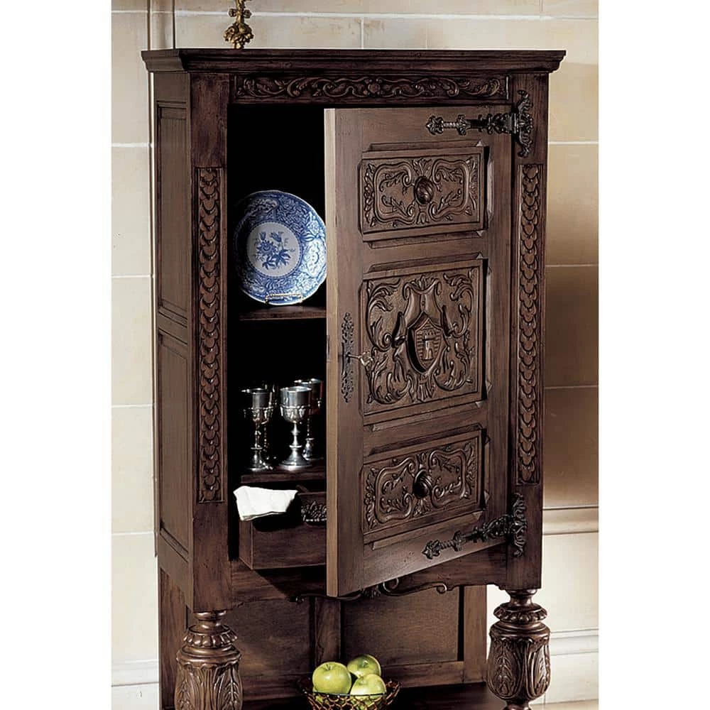A direct copy of a French Gothic Revival antique, this work of furniture art is virtually indistinguishable from a period original! From the amazing handcarving of heraldic crests and coats of arms to the melon bulb turnings, it requires Toscano craftsmen over two weeks to replicate this handsome armoire in fine mahogany, hand-rubbed to a burnished finish, and distressed just enough to reproduce a fine antique. The craftsmanship of the ironwork hinges, lock and key embellish the thick doors that open to reveal three shelves and two drawers for storage in this quality 5-feet tall masterwork. Toscano exclusive. 34″Wx17″Dx64″H. 120 lbs.