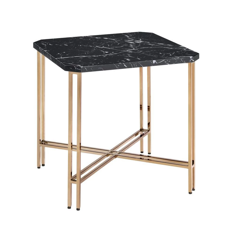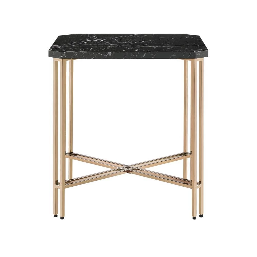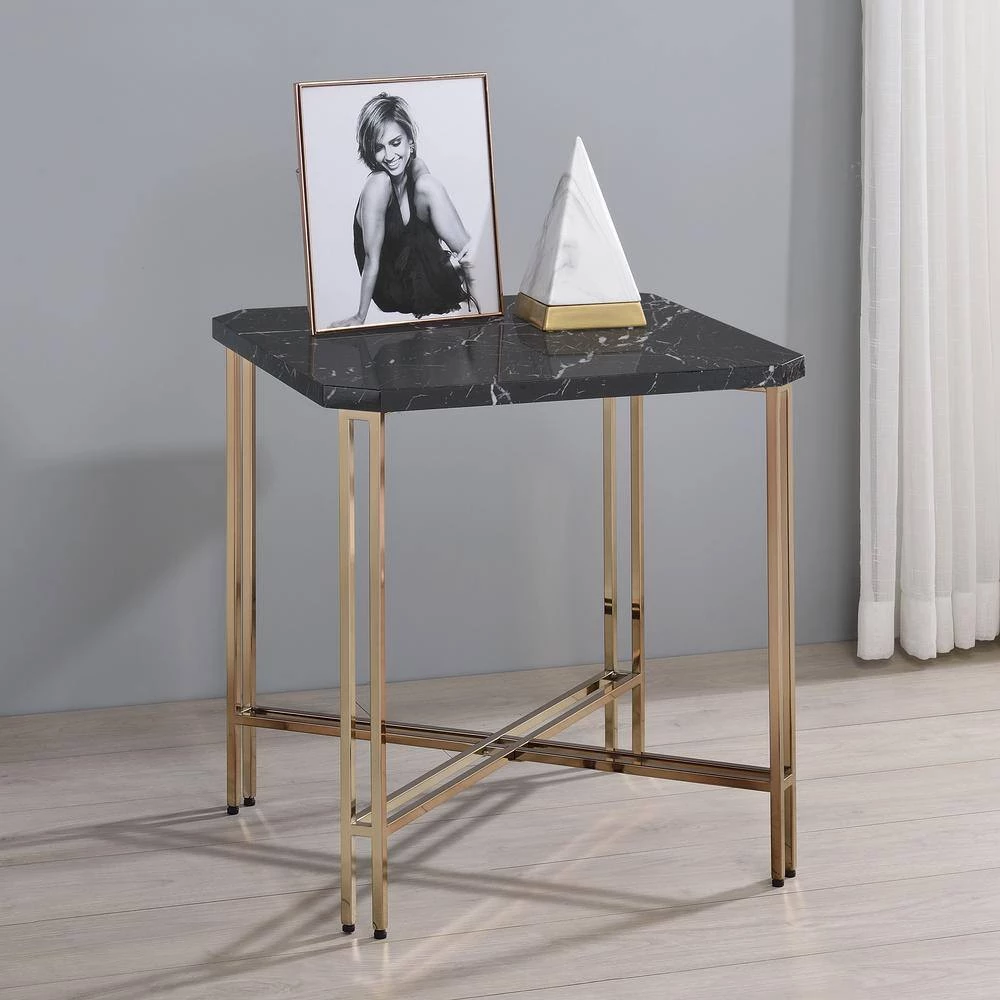 It’s easy to add a touch of glam to your space with the Daxton Square End Table. The black faux marble top features realistic veining and is complemented by the double-x shaped metal base in a soft gold finish. Also available in this collection are the matching cocktail table and sofa table (for purchase separately). Your purchase includes one end table.