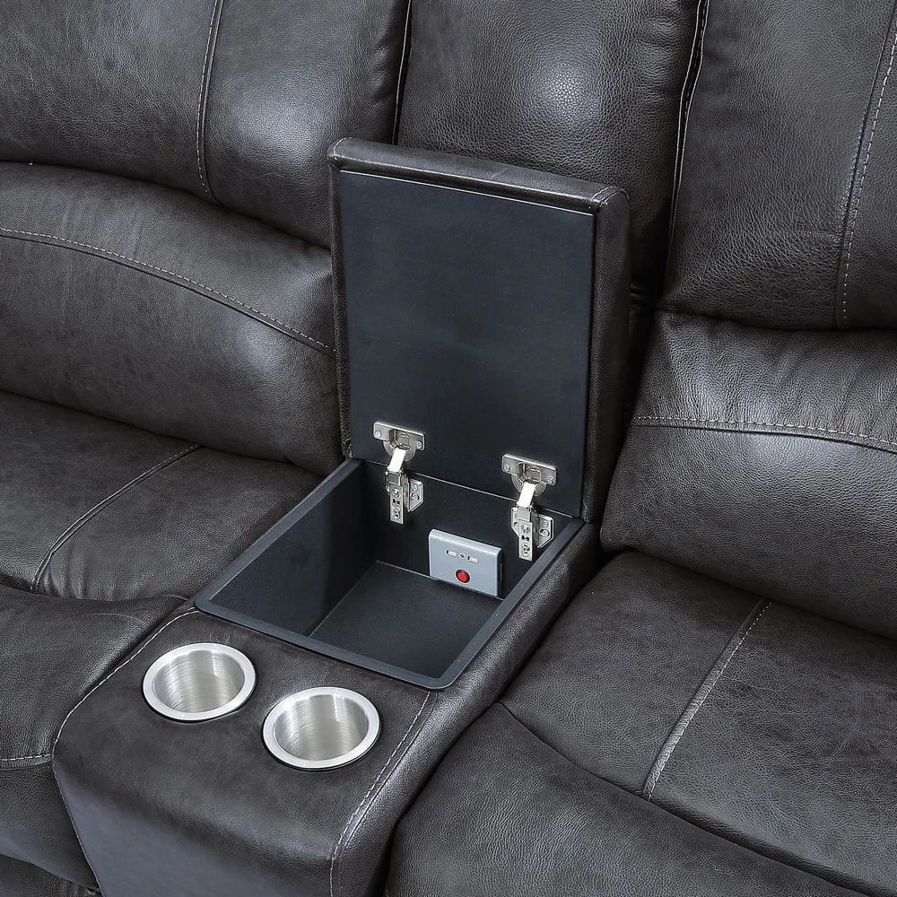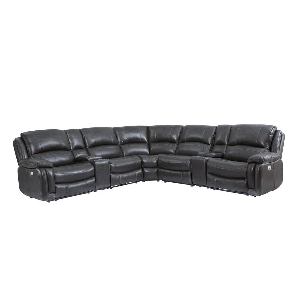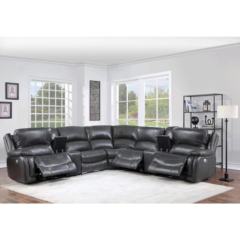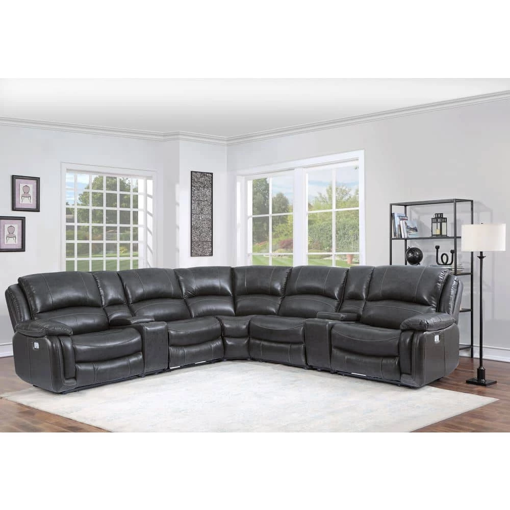A generously scaled showstopper, the Denver Dual-Power 7-piece Reclining Sectional is draped in a luxurious charcoal leather. Classic styling with both power headrest and footrest and seating for 5-with 3-seats that recline at the touch of a button and 2-consoles with cup holders for the ultimate in relaxation. USB charging ports are included on the armed recliners.