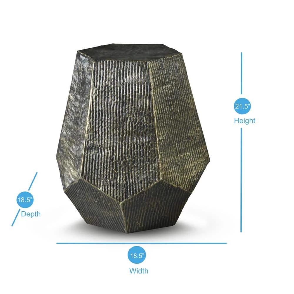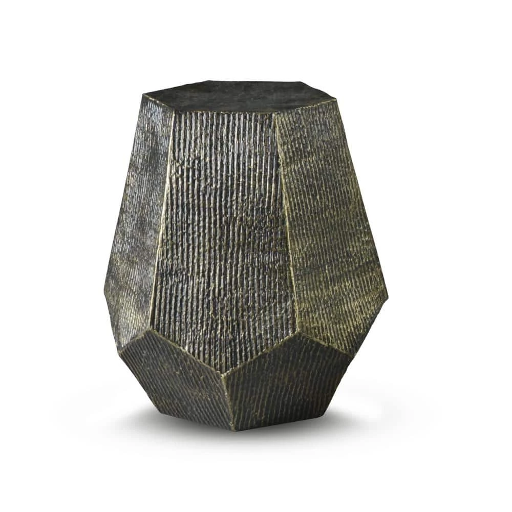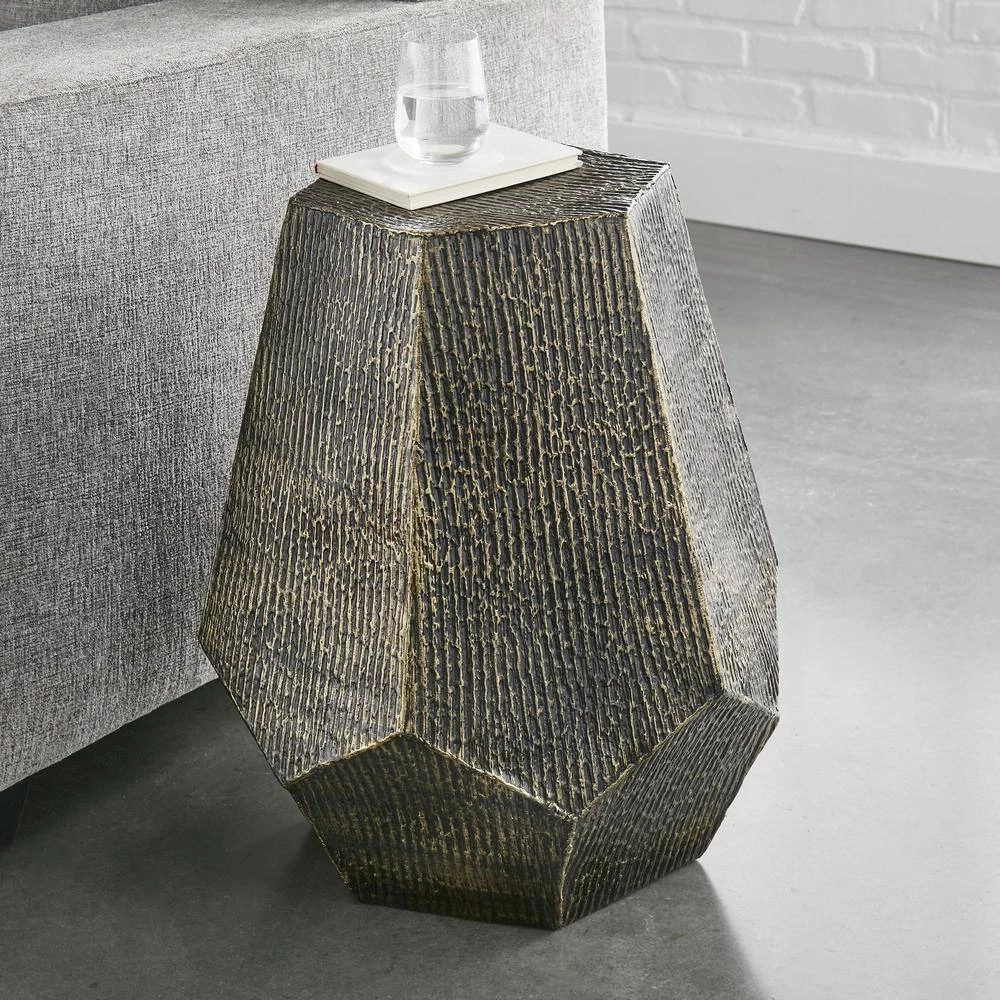 The Donato hexagonal End Table, constructed from hand-stamped iron, features architectural lines that appear to be carved by nature. An oil-rubbed brass finish shimmers in the light, making the table the jewel of your living space. Pair with the Donato Cocktail Table (sold separately) for a complete living room package. Your purchase includes one end table.