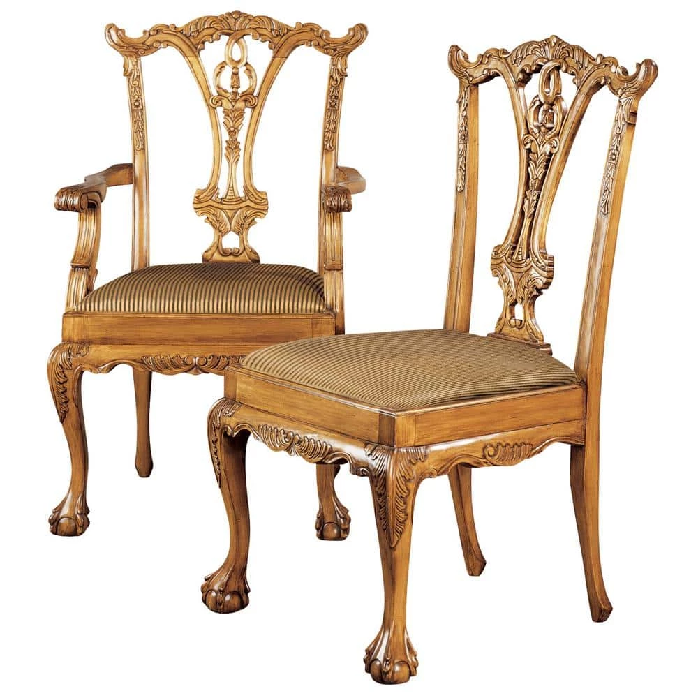 With truly exceptional hand-carving of acanthus, scrolls, and foliage and a warm, rich pine finish you won’t find elsewhere, these Toscano-exclusive chairs are in a class all their own. On claw-and-ball feet, the ornate carving that requires three days to complete, rises toward a filigree back that showcases the carvers art to full advantage. Our traditional European chairs, with comfortable suspension and upholstery in a quality jacquard of gold and blue stripes, create a classic heirloom. Our works of furniture art are as comfortable as they are beautiful. Set includes four side chairs and two arm chairs. Armchair: 24 in. Wx23 in. Dx39.5 in. H. 18 lbs. Side Chair: 23 in. Wx22 in. Dx39.5 in. H. 14 lbs.