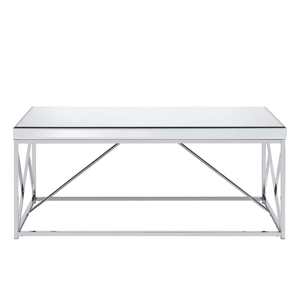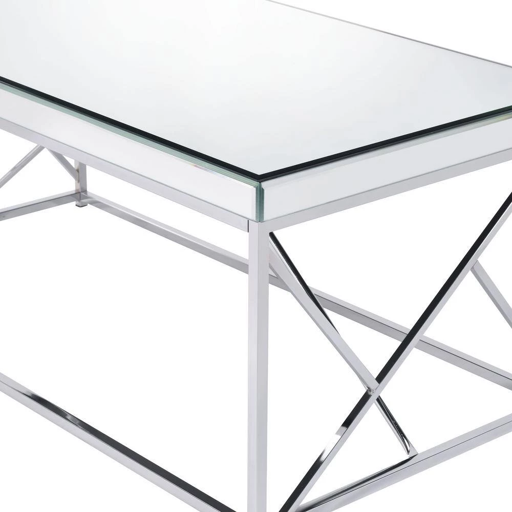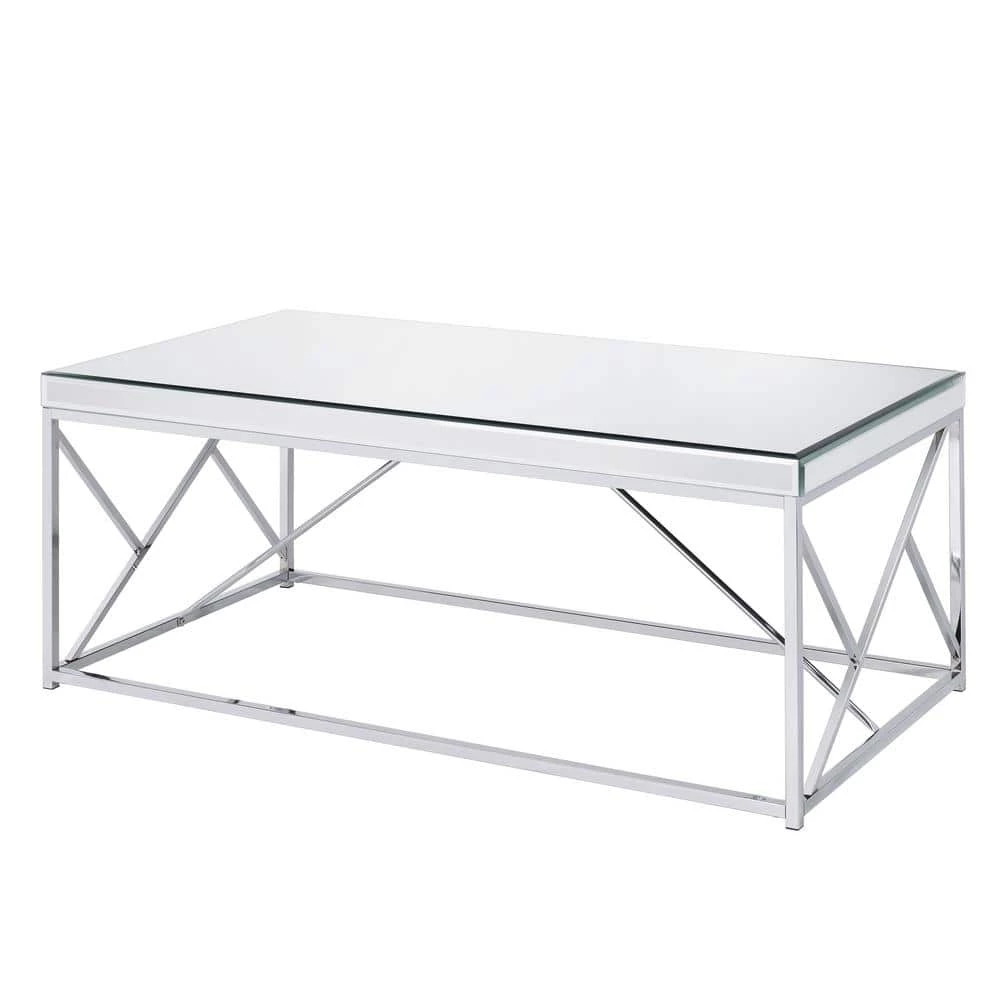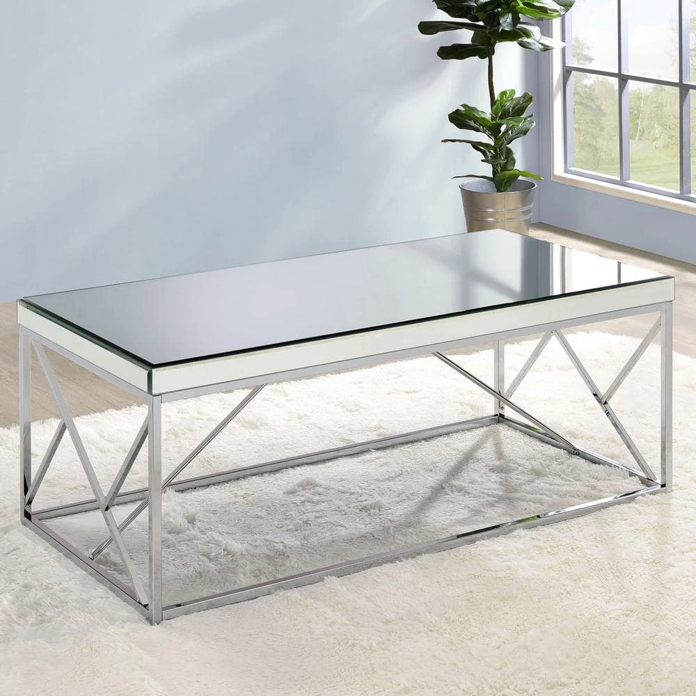 The Evelyn Cocktail Table offers modern elegance with its geometric base design and boxed mirrored top. You will enjoy how the light bounces off the table top and apron rail to create a larger more vibrant space. The mirrored table also features a sturdy iron base that is finished in gleaming chrome. Available for purchase separately is the matching end table. Your purchase includes one cocktail table.