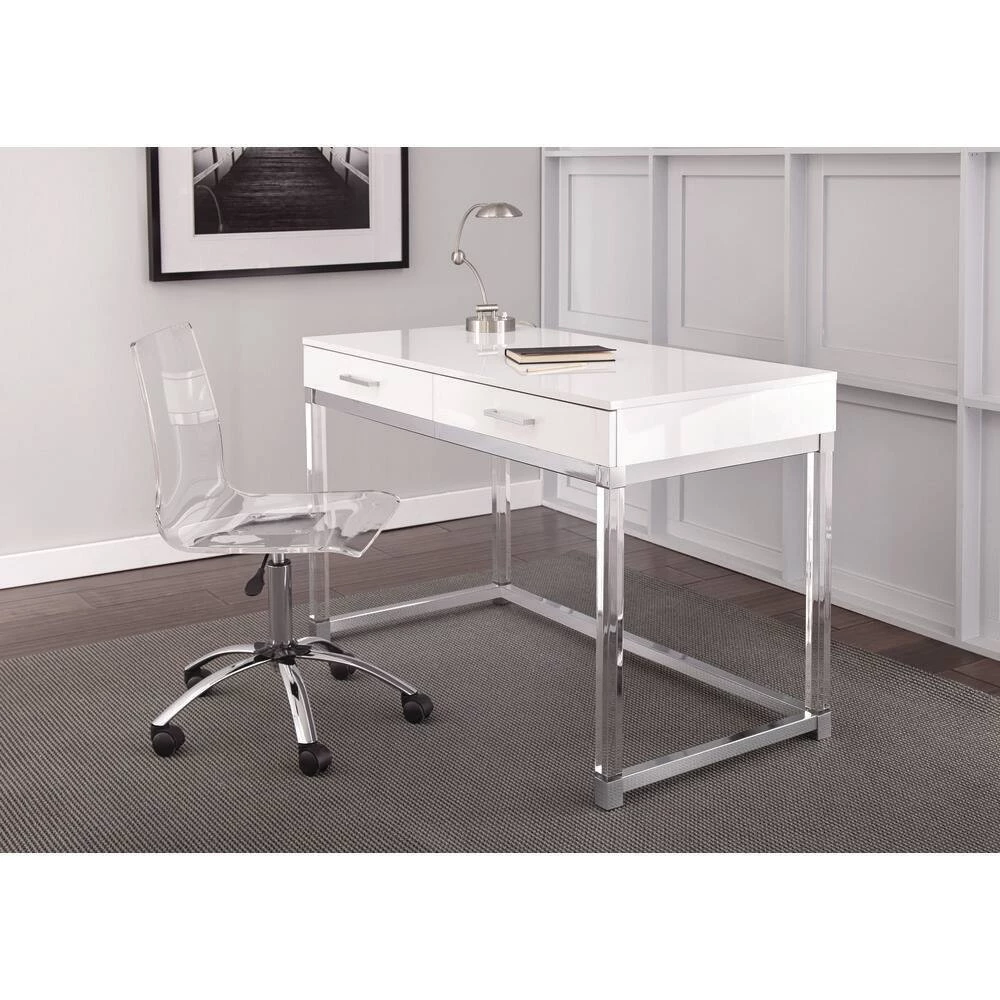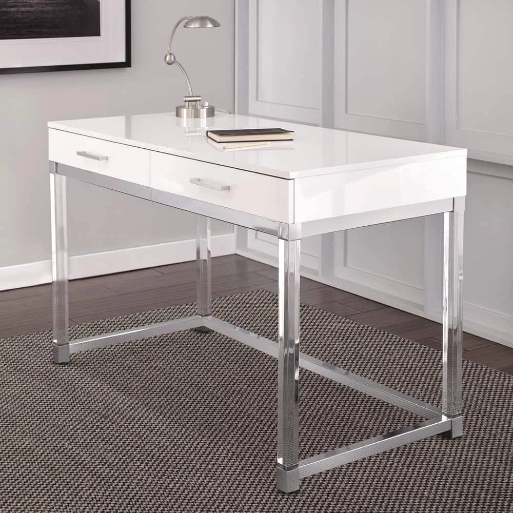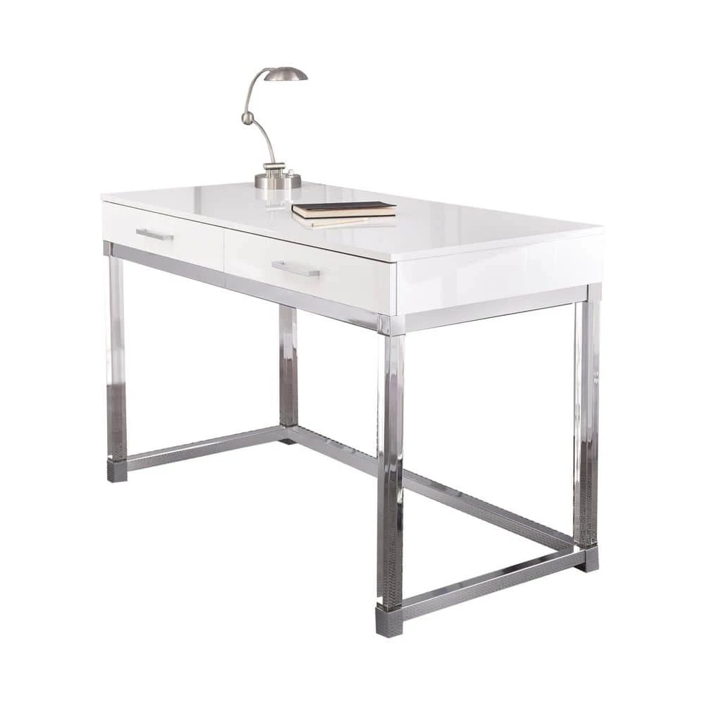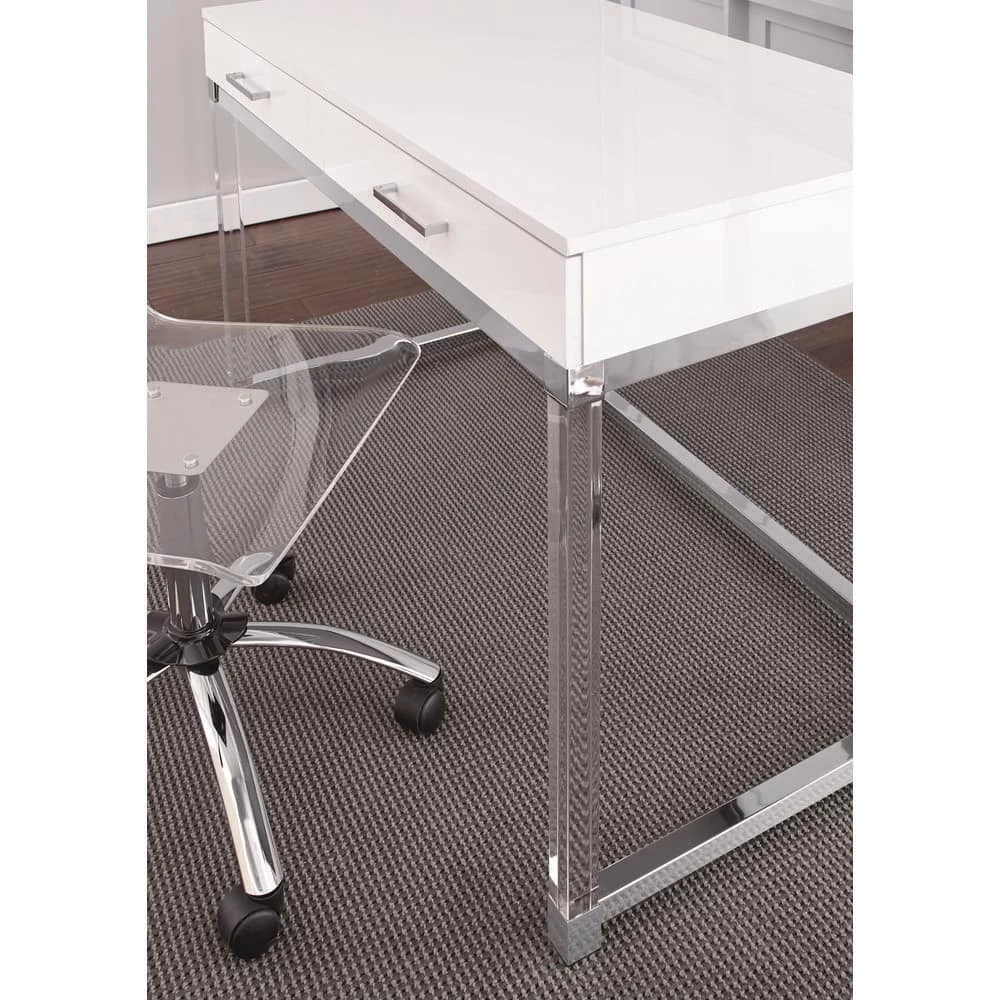 The sleek contemporary styling of the Everett Desk is an interesting mix of chrome, acrylic and painted wood finishes. It’s compact design allows it to fit in smaller spaces if needed and the light, airy look will complement various decors. Two drawers for storage so you can keep your desk space clear and uncluttered. Your purchase includes 1 desk.