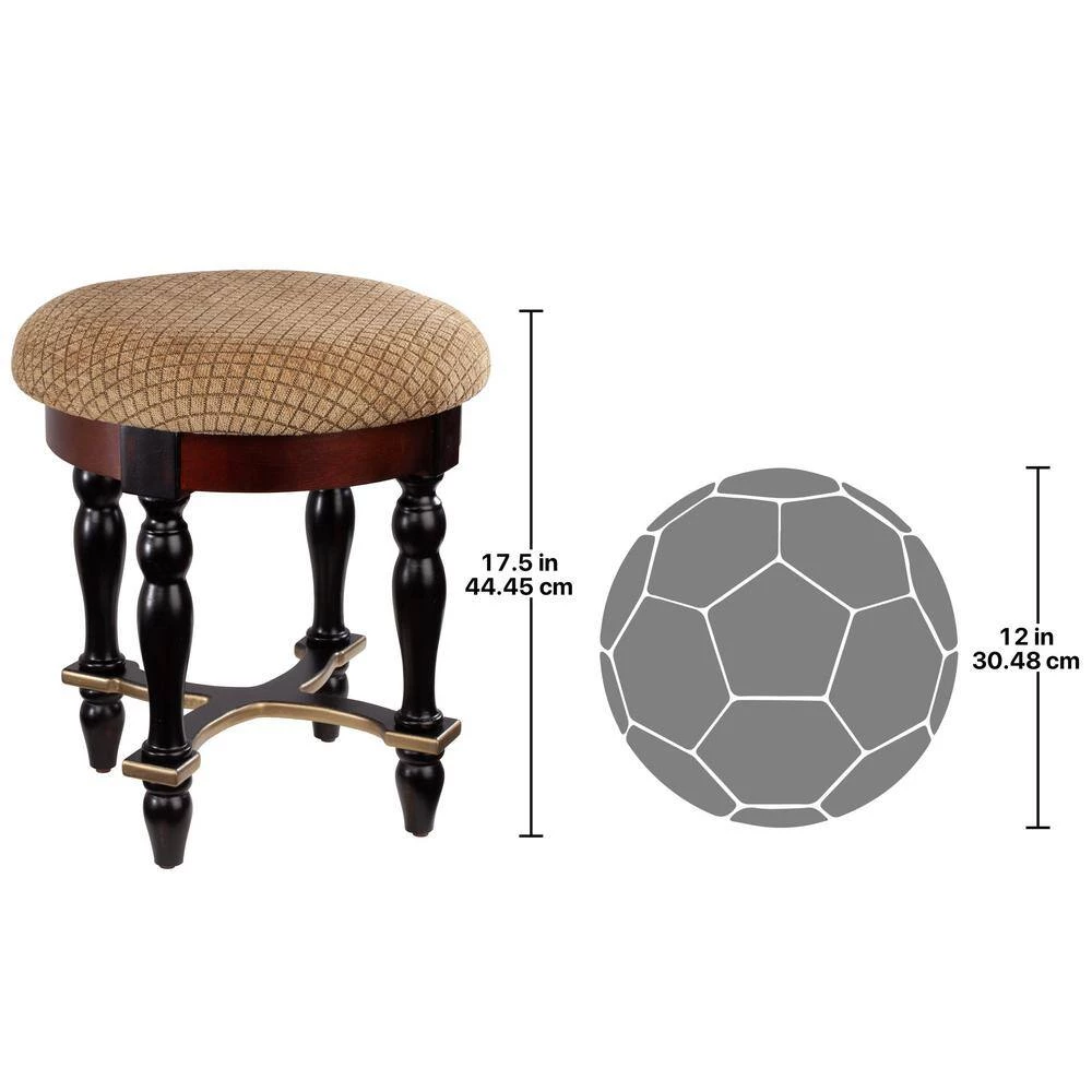 Rising from hand-turned legs to a perfectly cushioned, soft brushed chenille upholstered seat, this solid hardwood stool is ideal bedside, in a luxury bath, or at a ladies’ vanity. Hand-crafted solid hardwood replica pays homage to more highly priced original antiques. This versatile, dark walnut-hued work of European-style furniture art is a refined, yet practical addition to home decor. 15″Wx15″Dx17.5″H. 7 lbs.