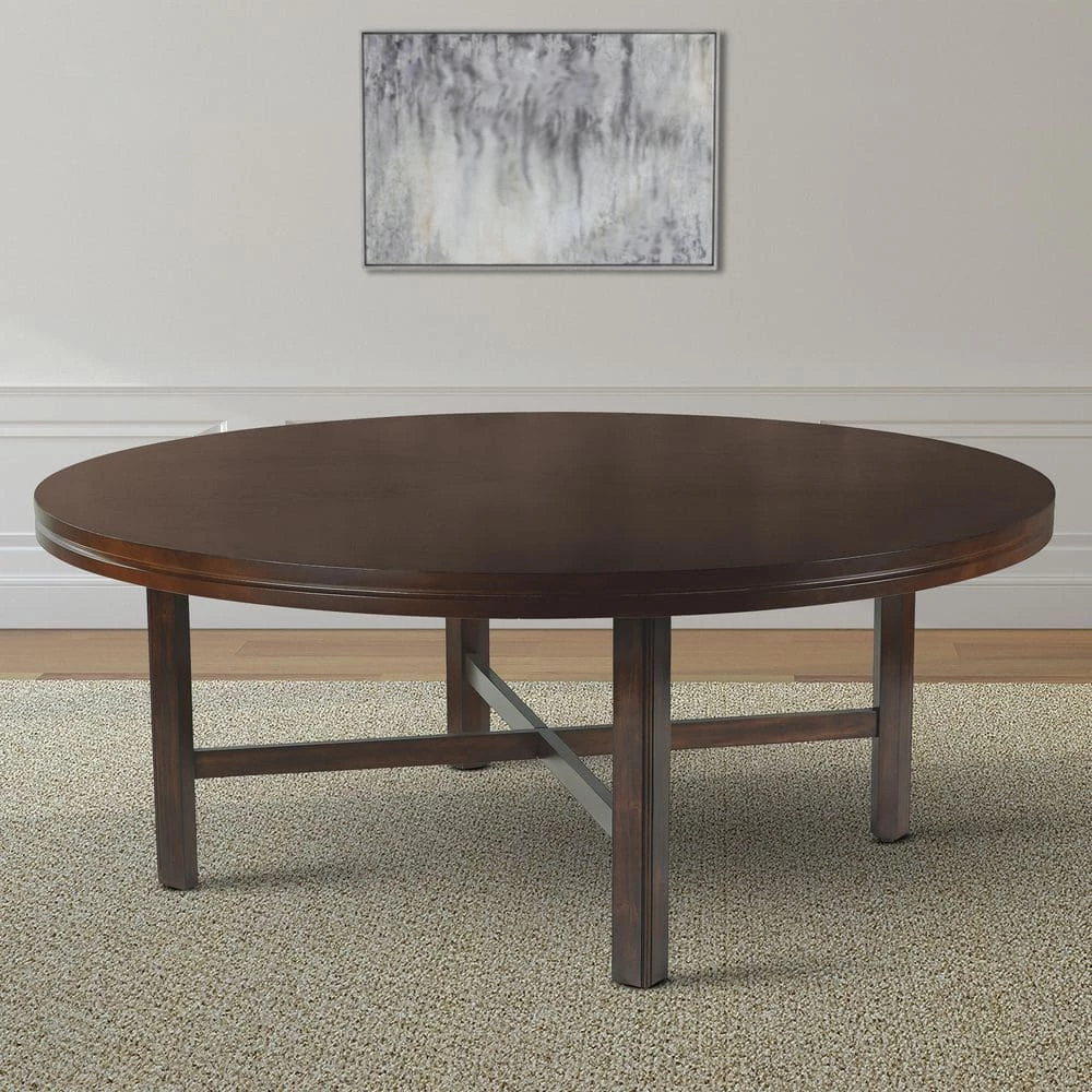 The Hartford round dining table is the essence of comfortable contemporary style, designed to bring out the best in dining spaces of all sizes. Made of hardwood solids and oak veneers with a dark oak wood finish, the 72 in. round dining table has a unique double top design with fancy face oak veneer and seating for up to 8. A simple design that is functional, stylish, and a great place for dinner conversations. Your purchase includes 1 72 in. dining table only.