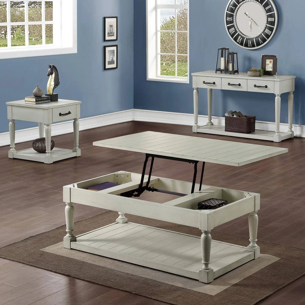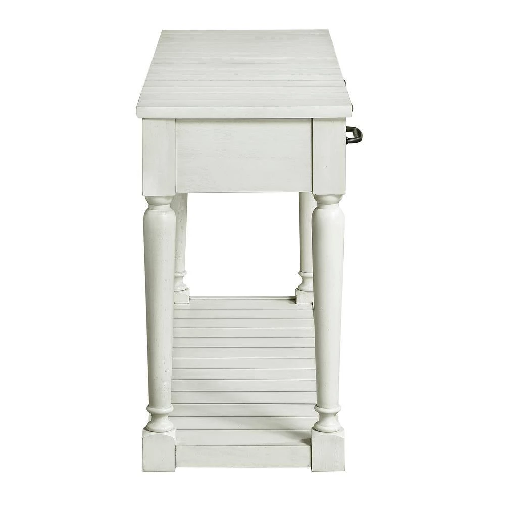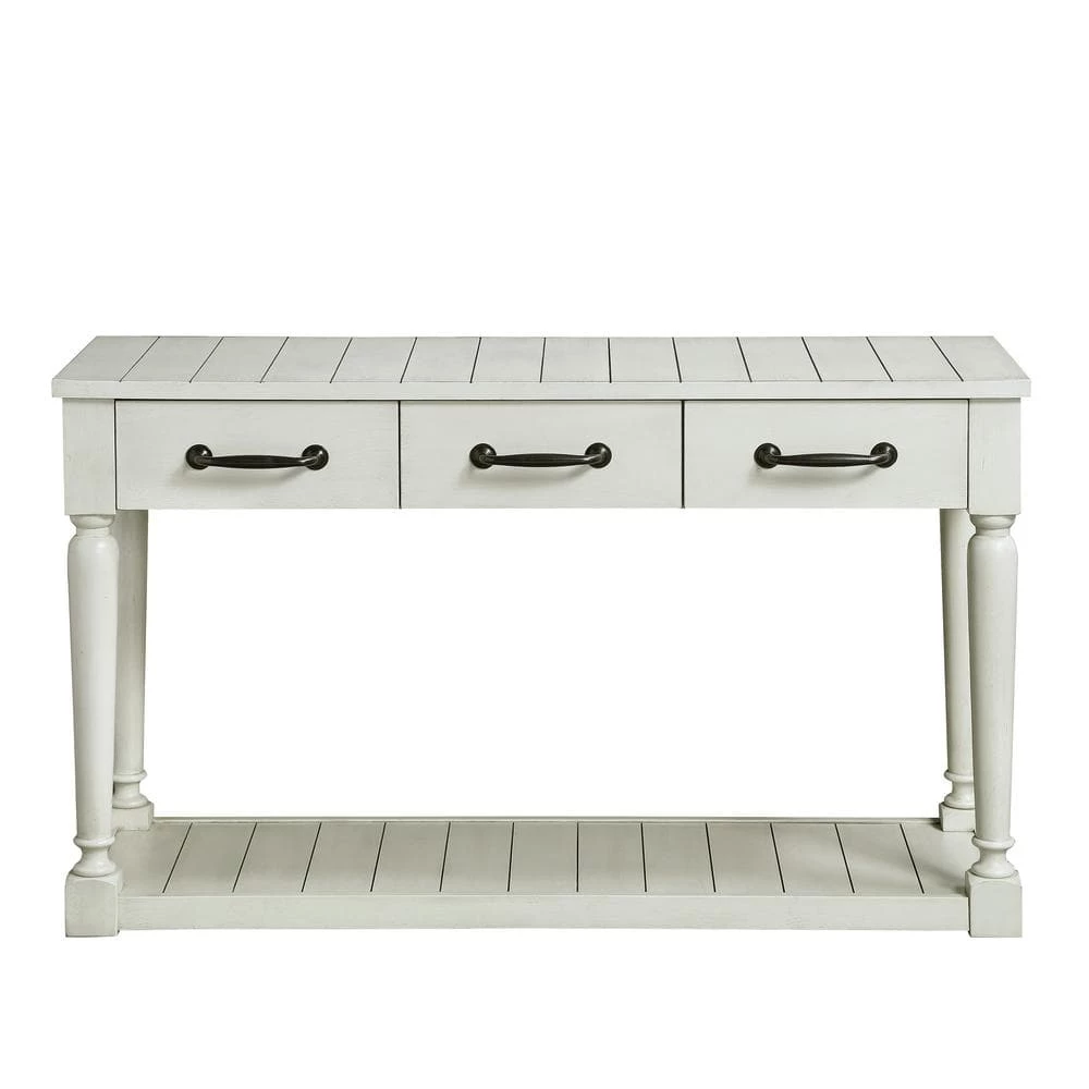 The Hemingway Sofa Table features classic cottage design with turned legs, a planked top and soft alabaster finish. The plinth base offers a sturdy foundation and the bottom shelf offers additional storage or display options while the 3-drawers offer storage of smaller items. Also available in this collection (purchase separately) are the matching lift-top cocktail table and end table. Your purchase includes one sofa table.