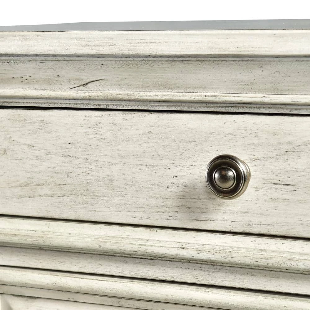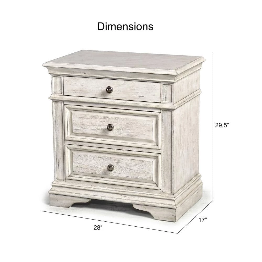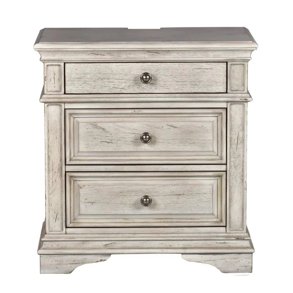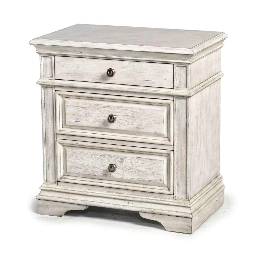 Highland Park features vintage styling in a classical bedroom collection. Sturdy construction using hardwood solids and veneers in a distressed rustic ivory finish. The nightstand offers three drawers with side mounted roller bearing drawer glides for smooth open and closing and a convenient USB and electrical port on the back. Gorgeous shaped moldings and framed drawer fronts accented by soft pewter drawer knobs, create an elegant farmhouse style.