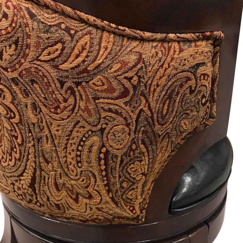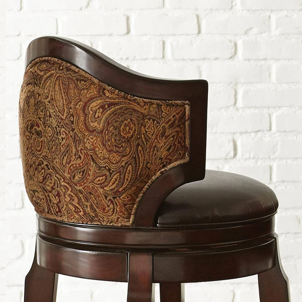 Your guests will enjoy their drinks at the bar in the stylish Jasper Bar stools. Offering a traditional style with black vinyl seat and back with decorative paisley upholstery material adorning the chair back. The swivel seat allows for easy access and the circular stretcher ensures your guests comfort no matter which way the turn.