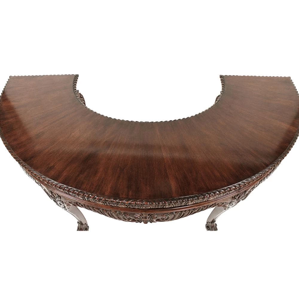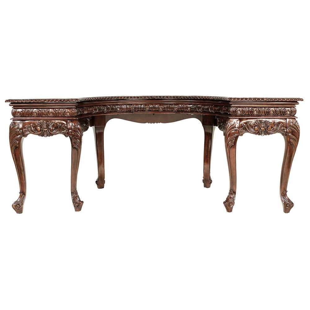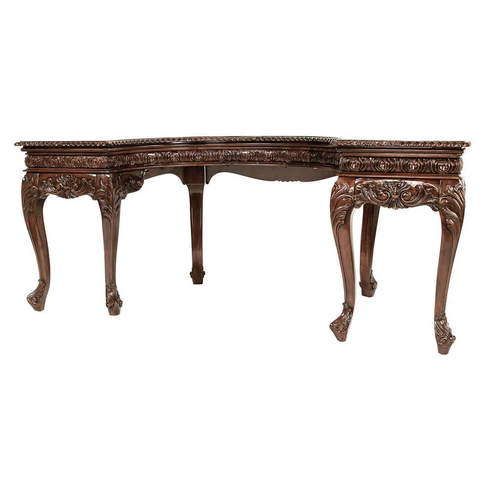 - Half-dozen cabriolet legs, center drawer and rich embellishments that adorn all sides of luxurious executive desk
