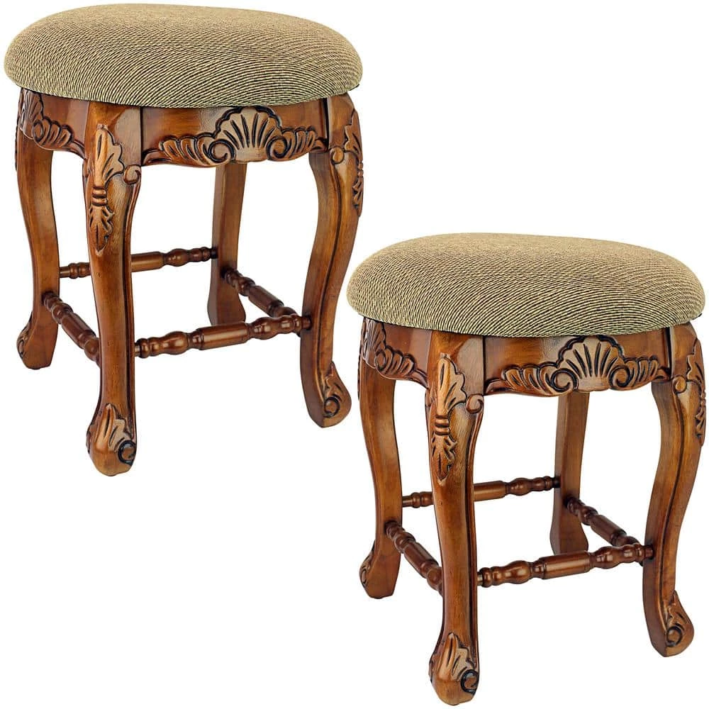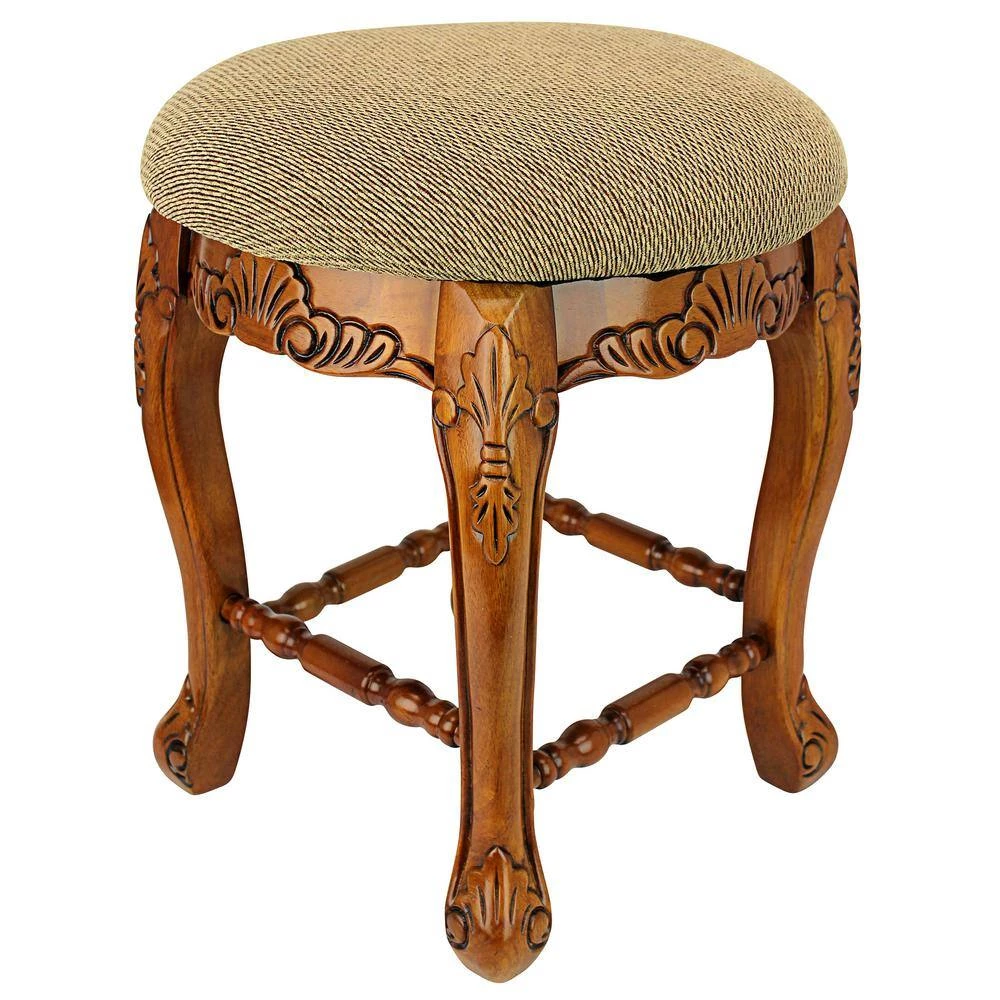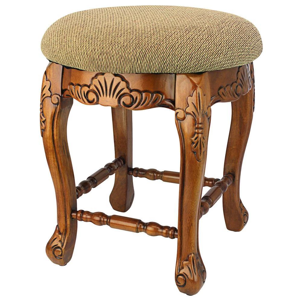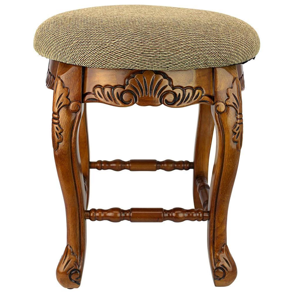 Rising from a hand-carved apron and cabriole legs to a perfectly cushioned seat, this Baroque-style solid hardwood stool is ideal bedside, in a luxury bath, or at a ladies vanity. Each piece is individually hand-finished by our artisans. Crowned with a generous expanse of tone-on-tone cream jacquard upholstery, this versatile, honey-hued work of European-style furniture art is as practical as it is elegant. 16.5″Wx16.5″Dx17.5″H. 8 lbs.