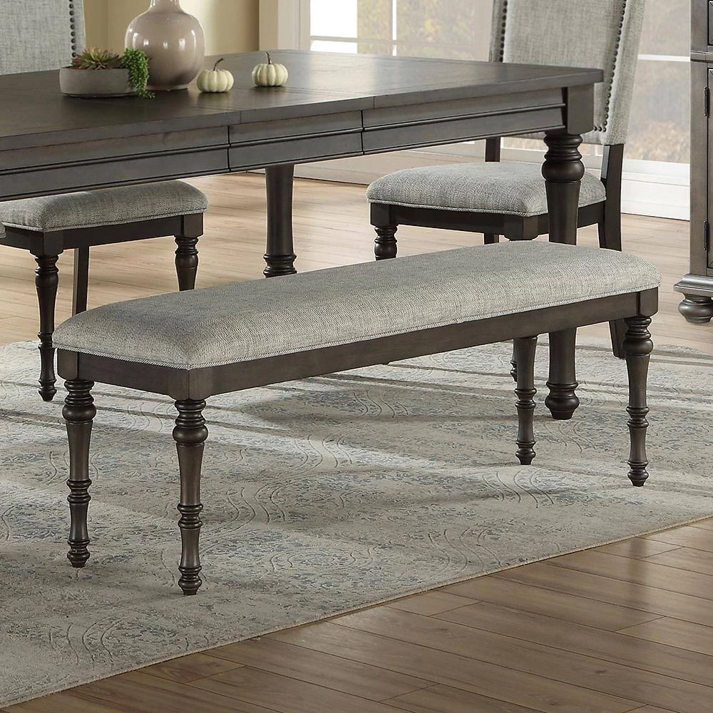 Linnett dining takes traditional dining styling and adds a modern twist to create a collection that is as comfortable as it is stylish. The Linnett Bench features graceful turned legs and a comfortable upholstered seat covered in a grey linen-look fabric to complement the sagebrush finish. Your purchase includes 1-dining bench.