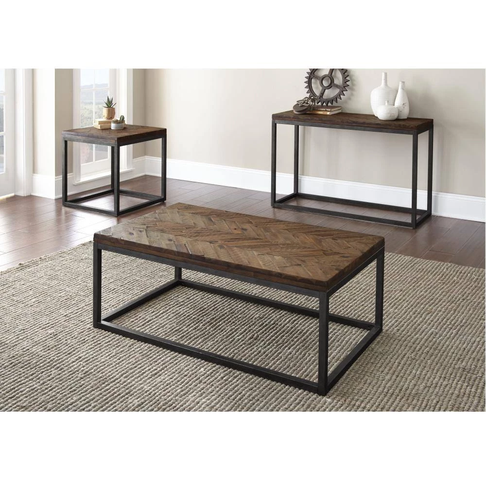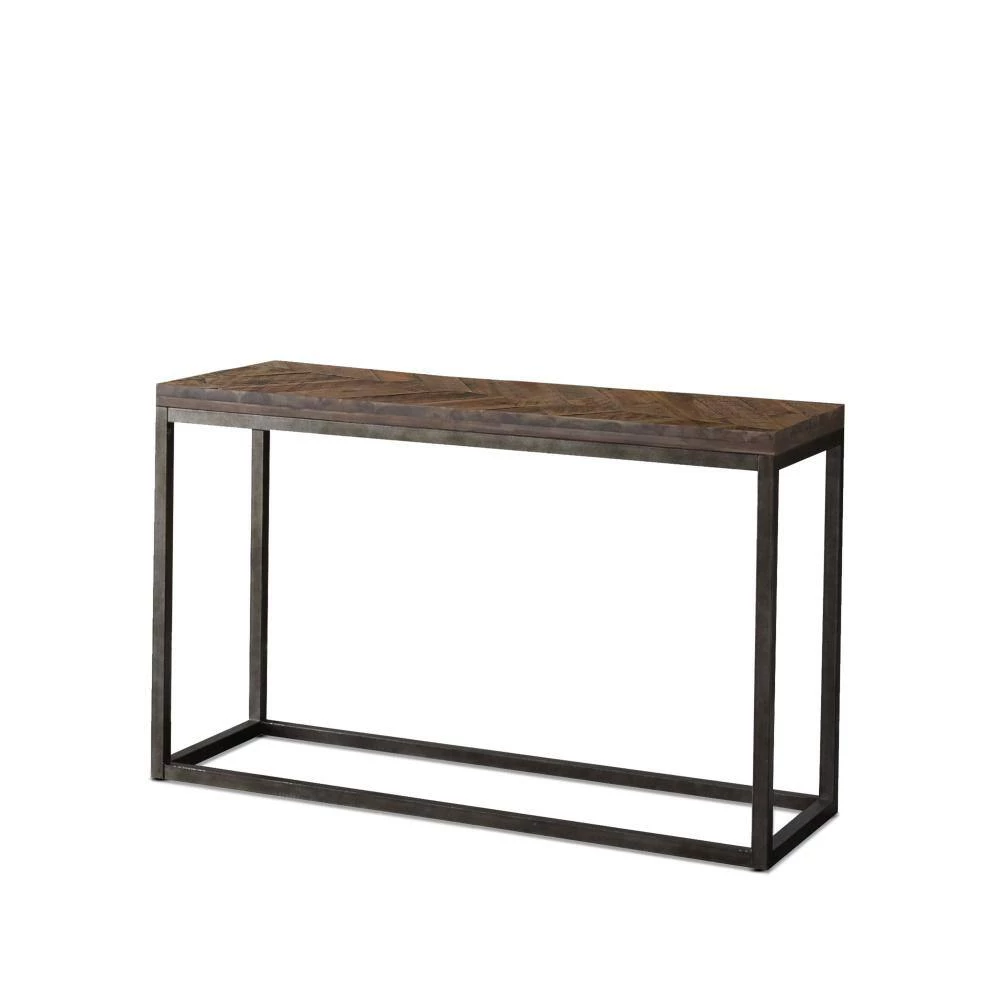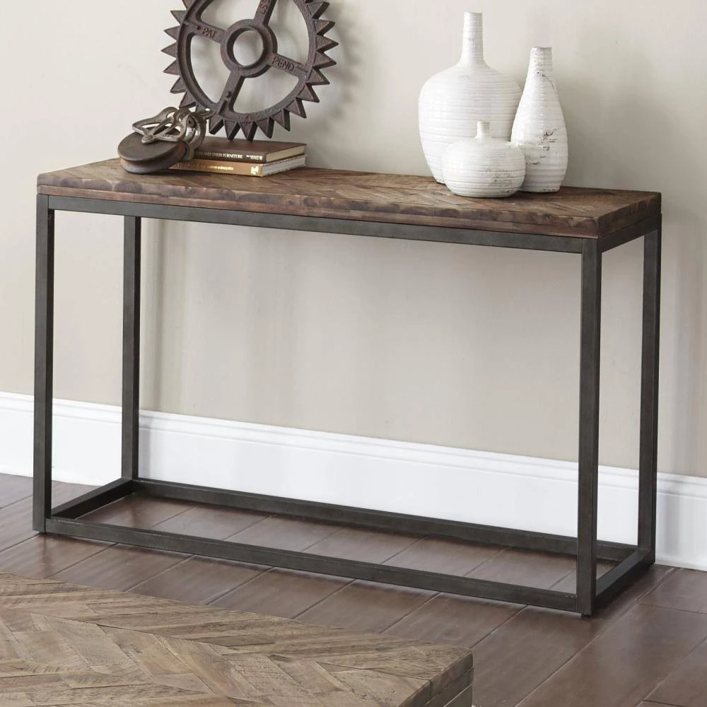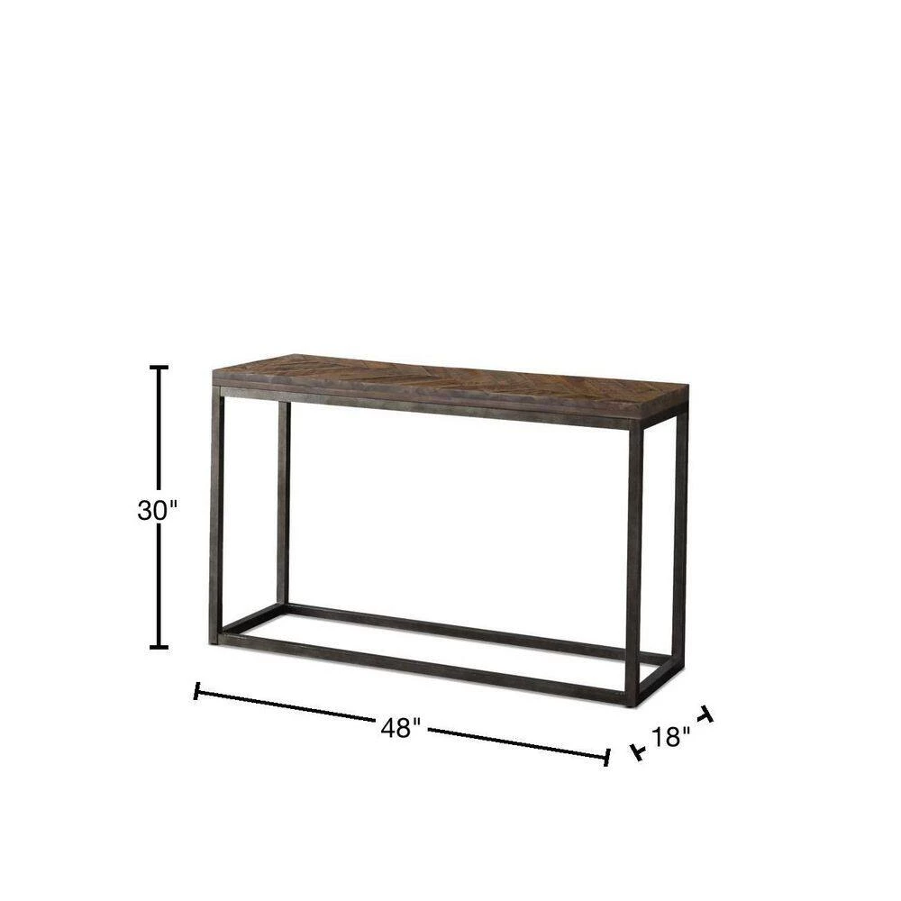 Modern, rustic styling is the essence of the Lorenza Occasional Collection. Distressed solid wood acacia tops feature a striking herringbone pattern contrasted by the vintage nickel finish of the steel base. Adding to the impressive look of the Lorenza Sofa Table is the unique double top design. Give your guests something to talk about with the addition of this dynamic collection to your home. Also available in this collection are the end table and cocktail table purchase separately. Your purchase includes one sofa table.