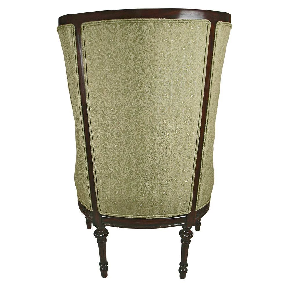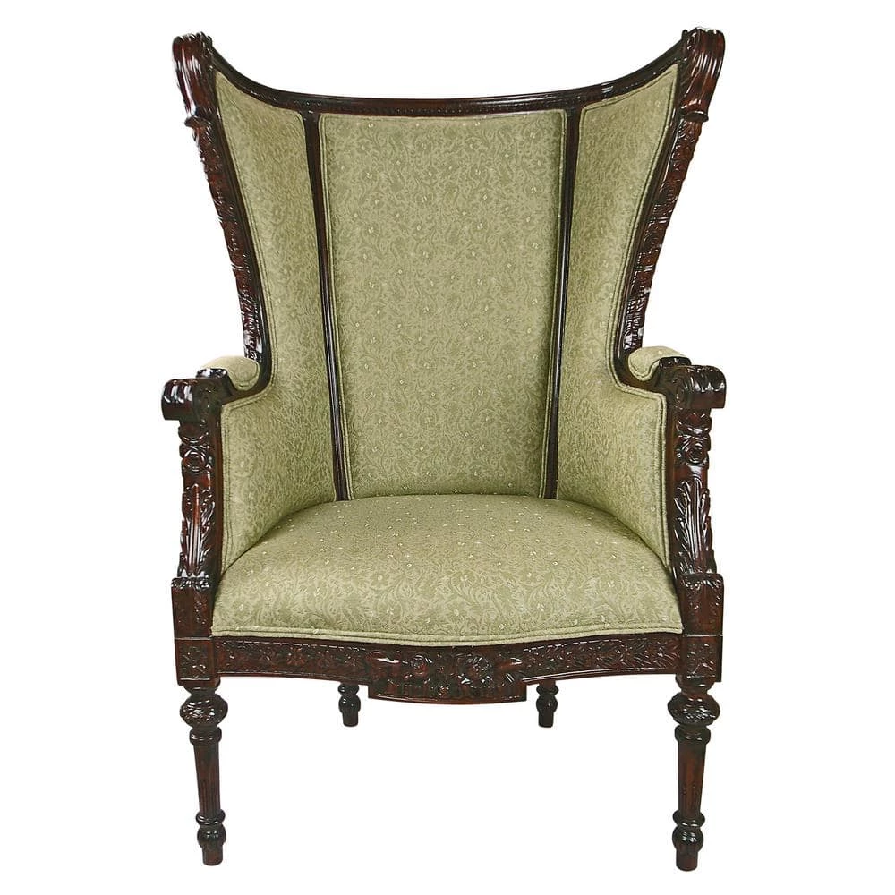 Once only a statue symbol of the elite, our exclusive, early 19th-century, English-inspired wing back chair is now a coveted piece for stunning homes. 1 of the most recognizable and timeless styles of classic furniture, our version boasts carved, fluted legs and upholstered arms. You’ll sink into the plush upholstered front and back in a quality, muted celadon jacquard with double welting. The glowing, solid mahogany wood of this syylish, period work of furniture art enhances the beauty of this exclusive created by our Design Toscano master carvers. 30 in. W x 23 in. D x 45 in. H. 33 lbs.