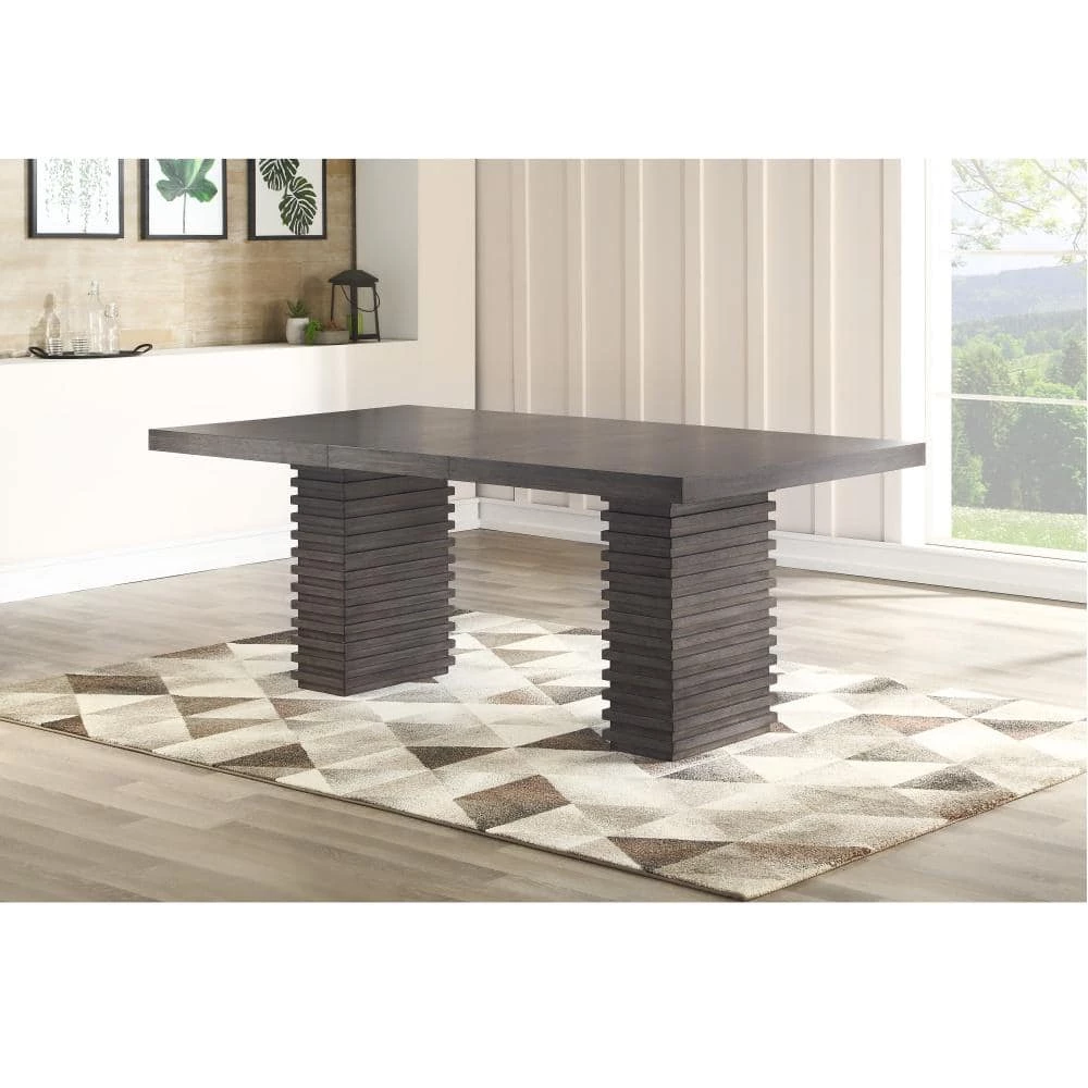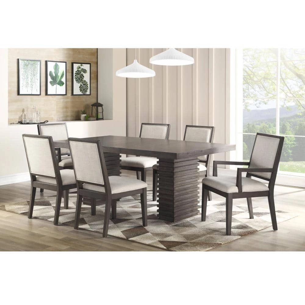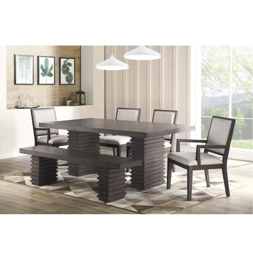 Entertain your family and friends with the bold contemporary styling of Mila. The Mila Dining Table features a fashion-forward washed grey finish over hardwood solids and ash veneers enhancing the modern trestle base. An 18 in. leaf is included extending the table to a spacious 78 in.. Matching seating options are available for purchase separately. Choose from the Mila Arm Chairs, Mila Side Chairs or Mila Bench. Your purchase includes one dining table.