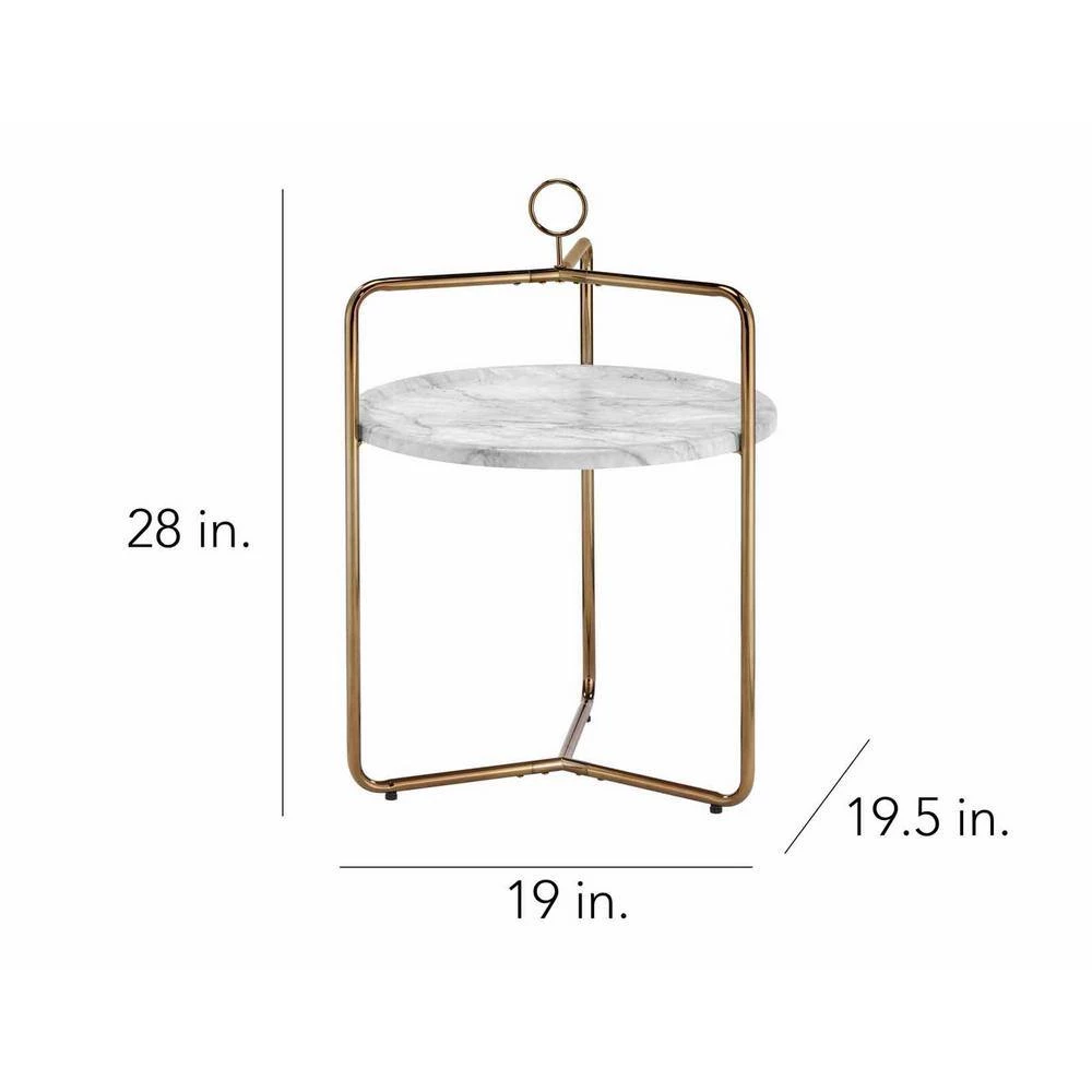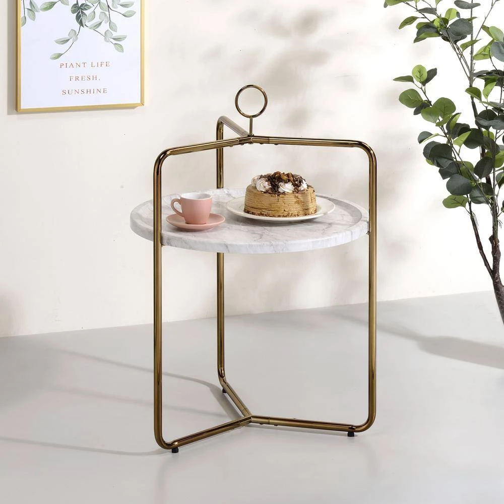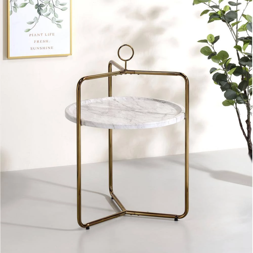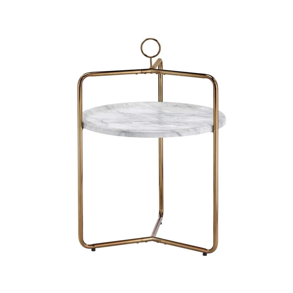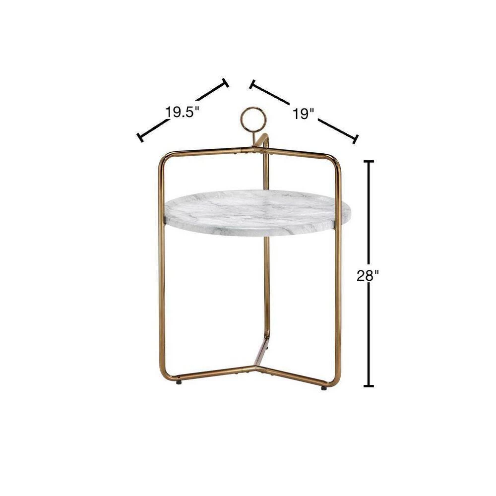 Light and airy with a modern touch, the Miro Side Table goes a step further with its molded serving tray and built in handle. The white faux marble tray is accented perfectly by the champagne bronze metal frame. Easy to pick up an move around the room, the lip keeps drinks and snacks stable. Functions well as a Bar Server, Serving Table, or as a unique End Table in your living area.