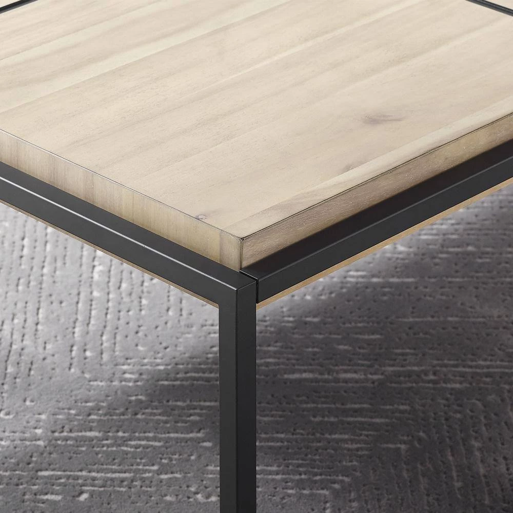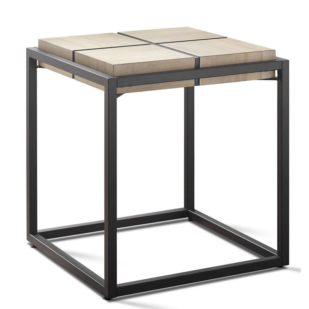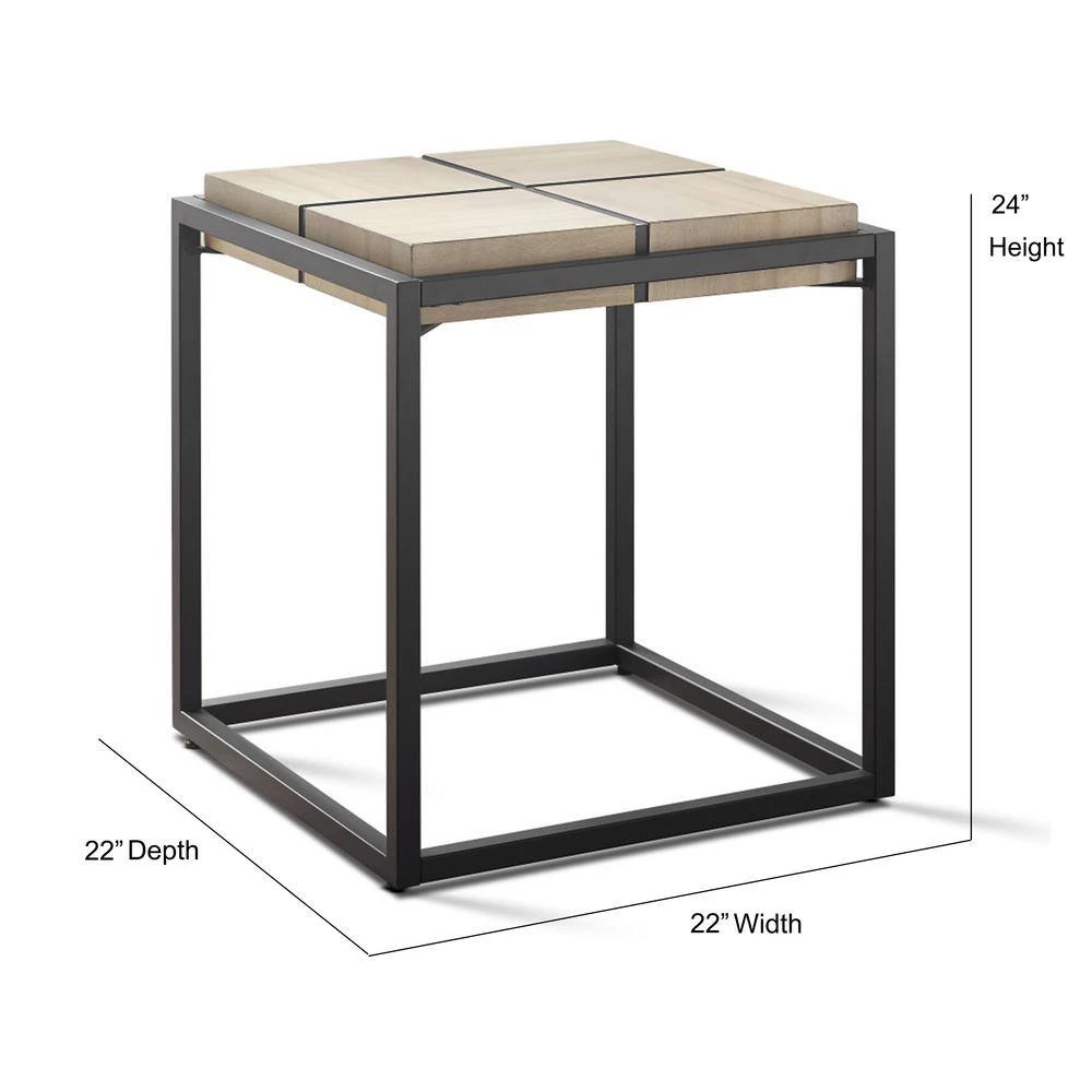 Oaklee brings grand scale and contemporary style to any living room. The end table features an acacia veneered four-panel top design finished in natural honey; the perfect contrast to the mixed-media dark grey iron base.