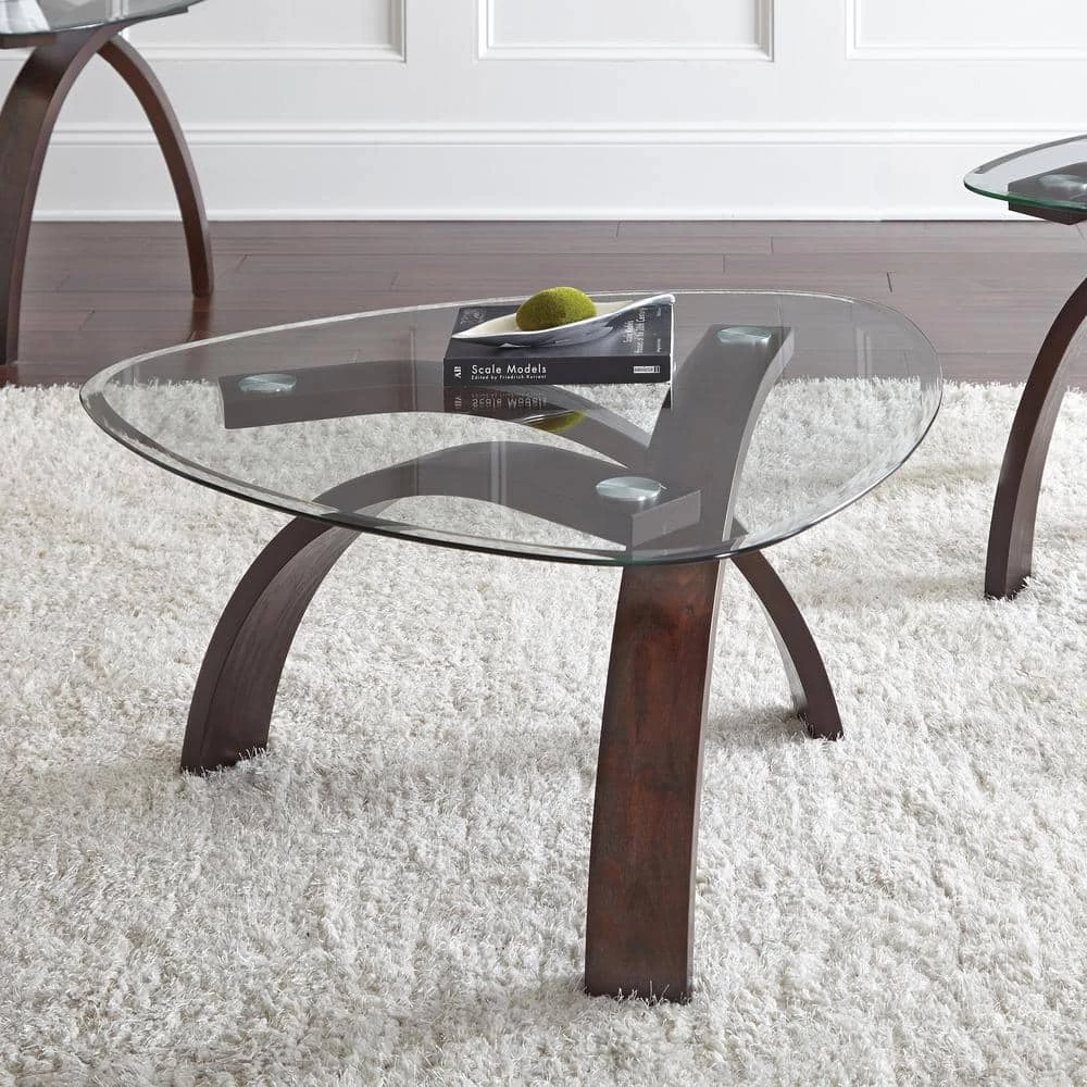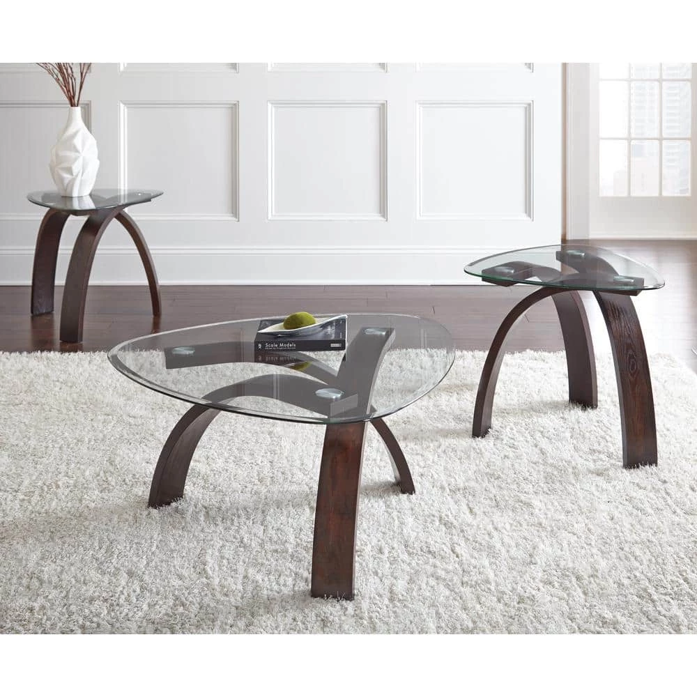 A contemporary mixed media set, Pitman features a sweeping bentwood base with unique triangular beveled glass tops. The interesting design has tremendous under-top visual appeal. A warm merlot cherry finish adds to the modern style of this very interesting table group.