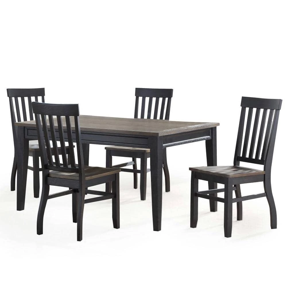 The Raven 5-Piece Dining Set features farmhouse styling with an updated look combining clean lines with a 2-tone ebony and driftwood finish. The Raven dining table exhibits cottage style with it’s plank effect top with breadbox veneer pattern, picture frame table apron and sturdy tapered legs. The Raven Side Chairs with schoolhouse styling feature a scoop seat for comfort and stretchers with a tapered leg for strength and support. Your purchase includes one dining table and four dining side chairs.
