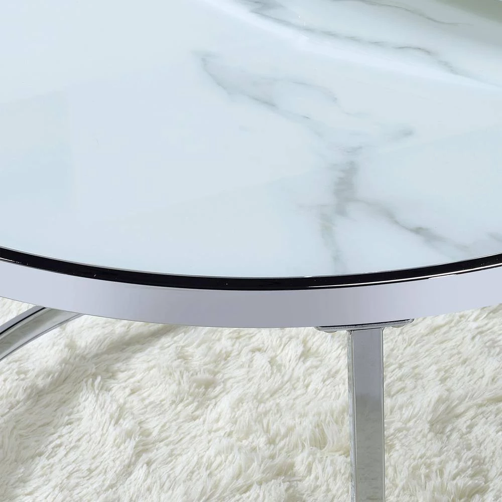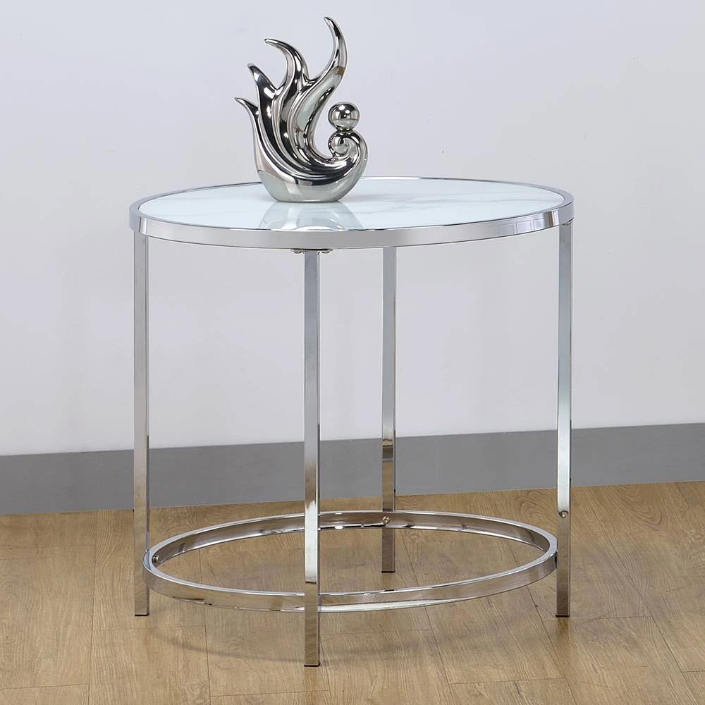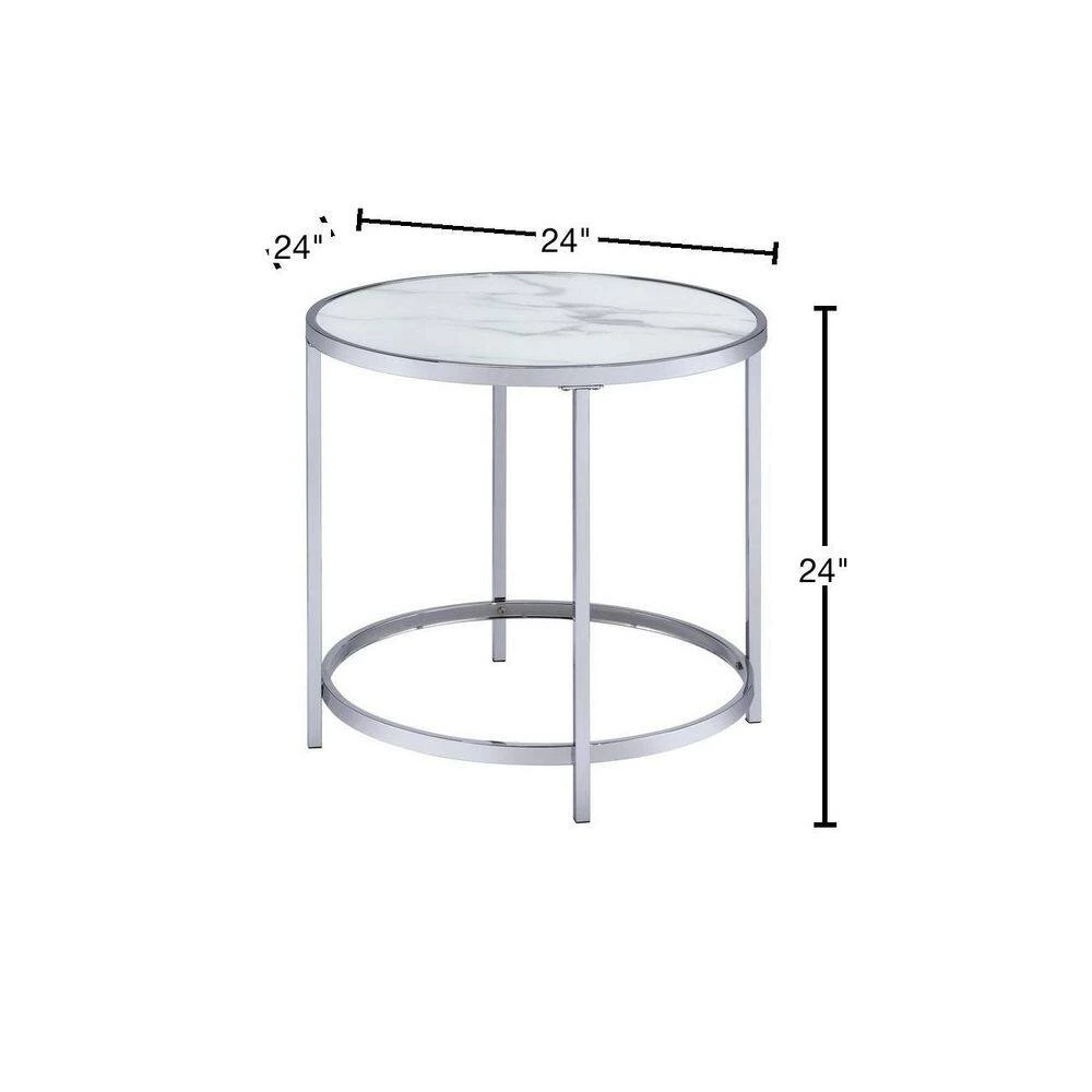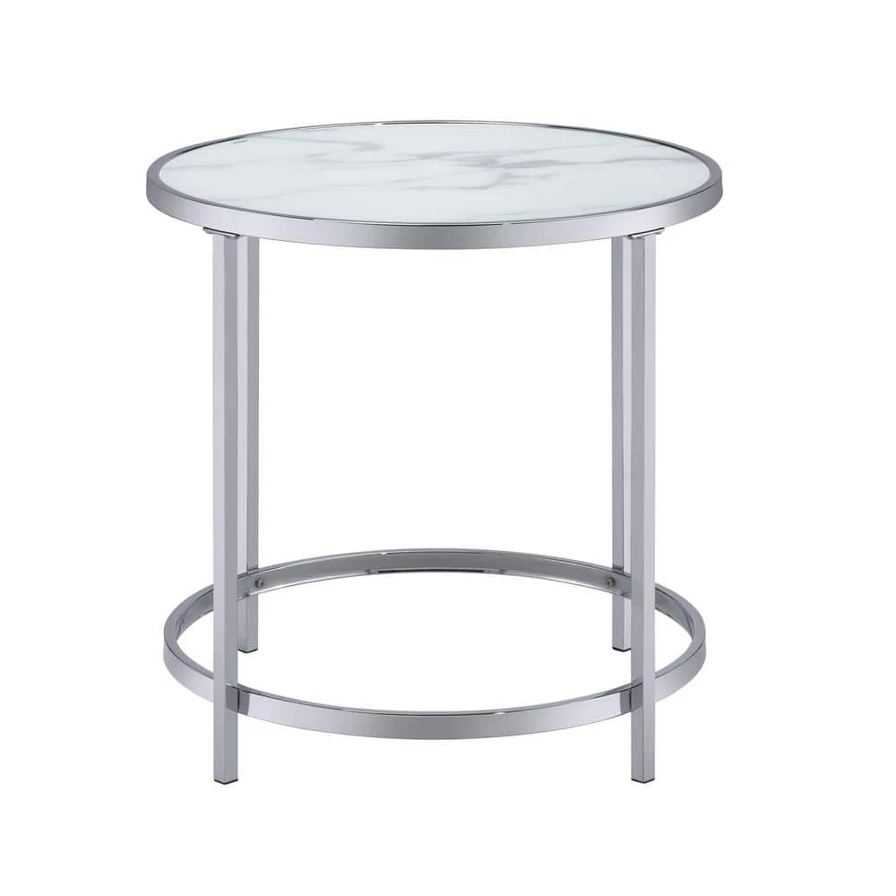 Experience an elegant interplay of flowing shapes and mixed media with the Rayne End Table. Faux marble, glass and chrome combine to bring interest and multi-level dimension to any living area. Circular chrome stretchers provide stability and add interest. Also available in this collection are nesting cocktail tables (purchase separately). Your purchase includes one end table.