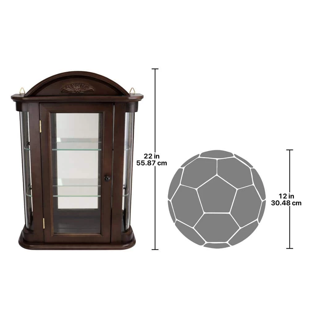 Gently curved acrylic side panels make this unique, Design Toscano exclusive, mirror-backed curio cabinet viewable on three sides. Two removable glass shelves shed further light on your prized possessions. Crafted of solid hardwood, hand-painted in a rich mahogany wood tone hue and topped with a crown pediment and acanthus detailing, it boasts a single glass door with matching wood handle and curio cabinet hardware. Ready to mount on the wall or set on a console or mantel. With a hand-finished mahogany wood tone hue to accent any decor, the Rosedale Curio Cabinet has ample space to draw all eyes to your statues, enameled eggs and other cherished heirloom collectibles. 15.5 in. W x 5.5 in. D x 22 in. H 9 lbs.