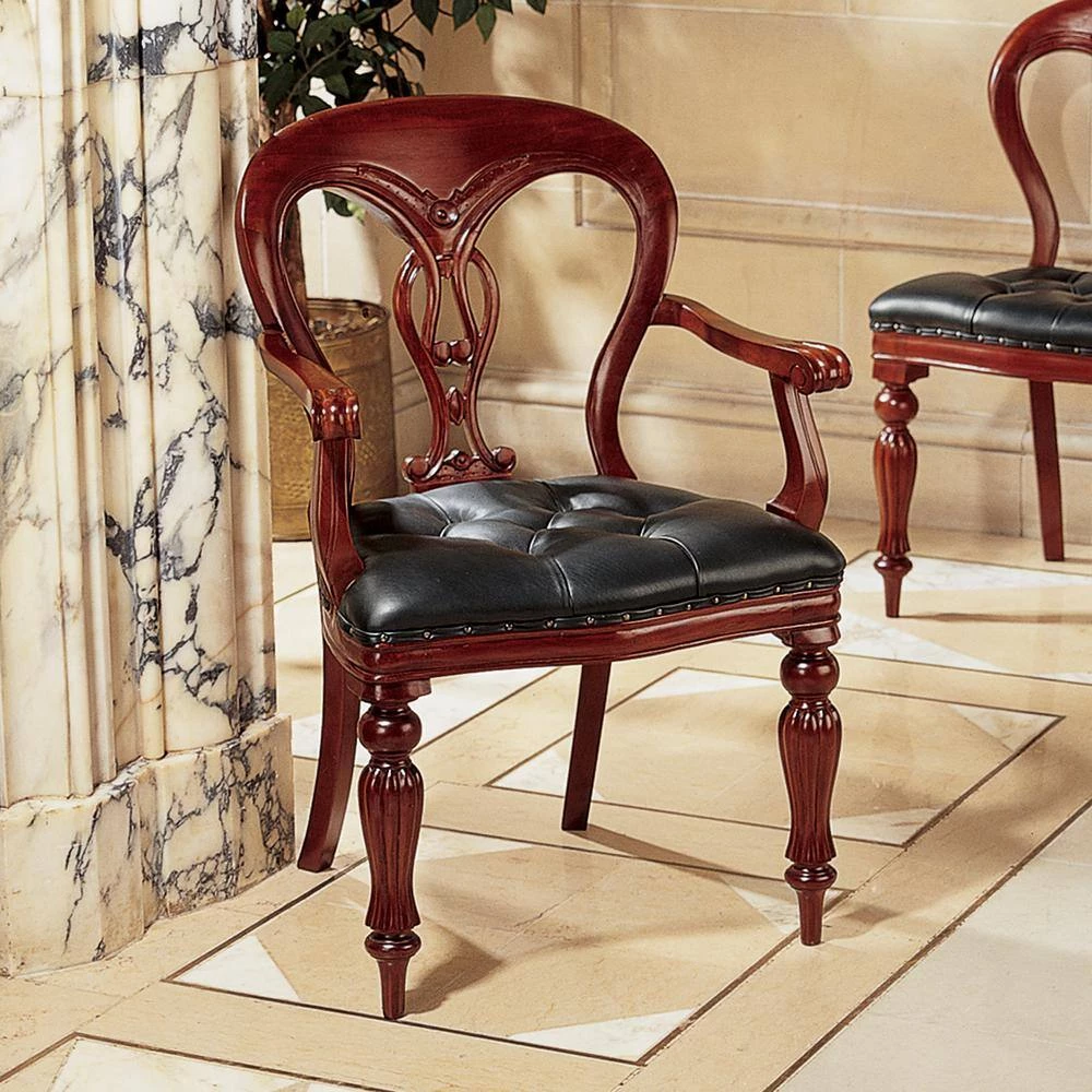 With its hand-carved solid mahogany cyma back, strong fluted legs and broad, invitingly tufted leather seat, this chair gives an impression of period authenticity. Our exclusive replica is handsomely hand-carved to stand alone or as a set. 24 in. W x 22 in. D x 35 in. H. 15 lbs.