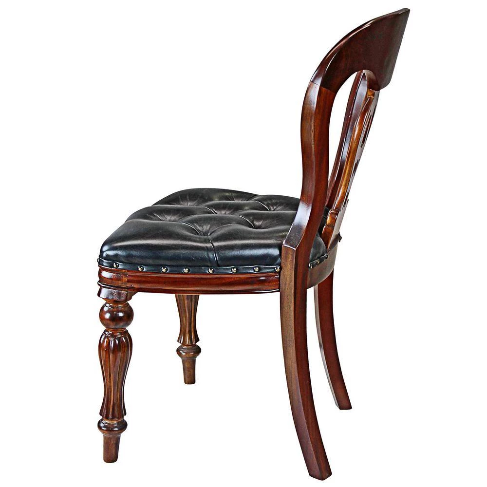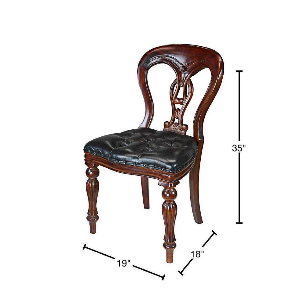 With its handcarved solid mahogany cyma design back, strong fluted legs and broad, invitingly tufted leather seat, this chair gives an impression of period authenticity. Our exclusive replica is handsomely handcarved to stand alone or as a set. 19 in. W x 18 in. D x 35 in. H. 15 lbs.