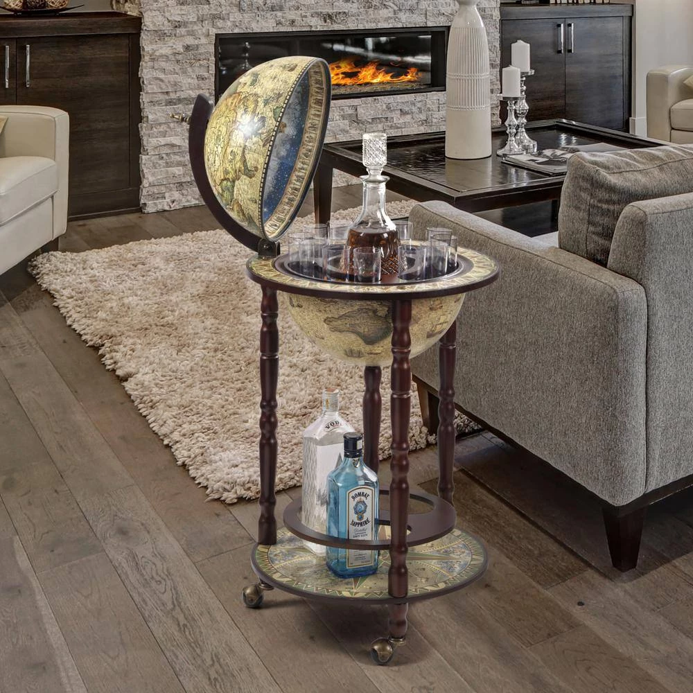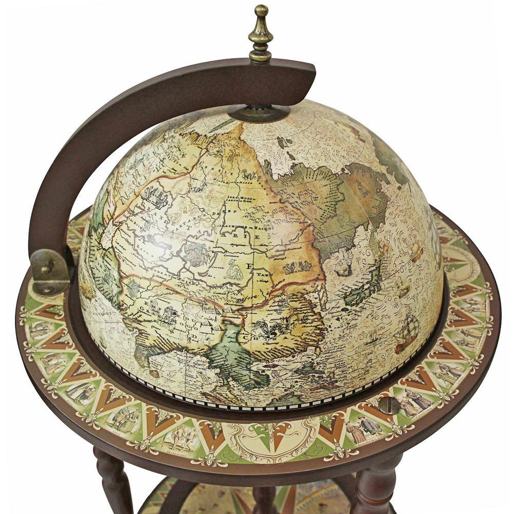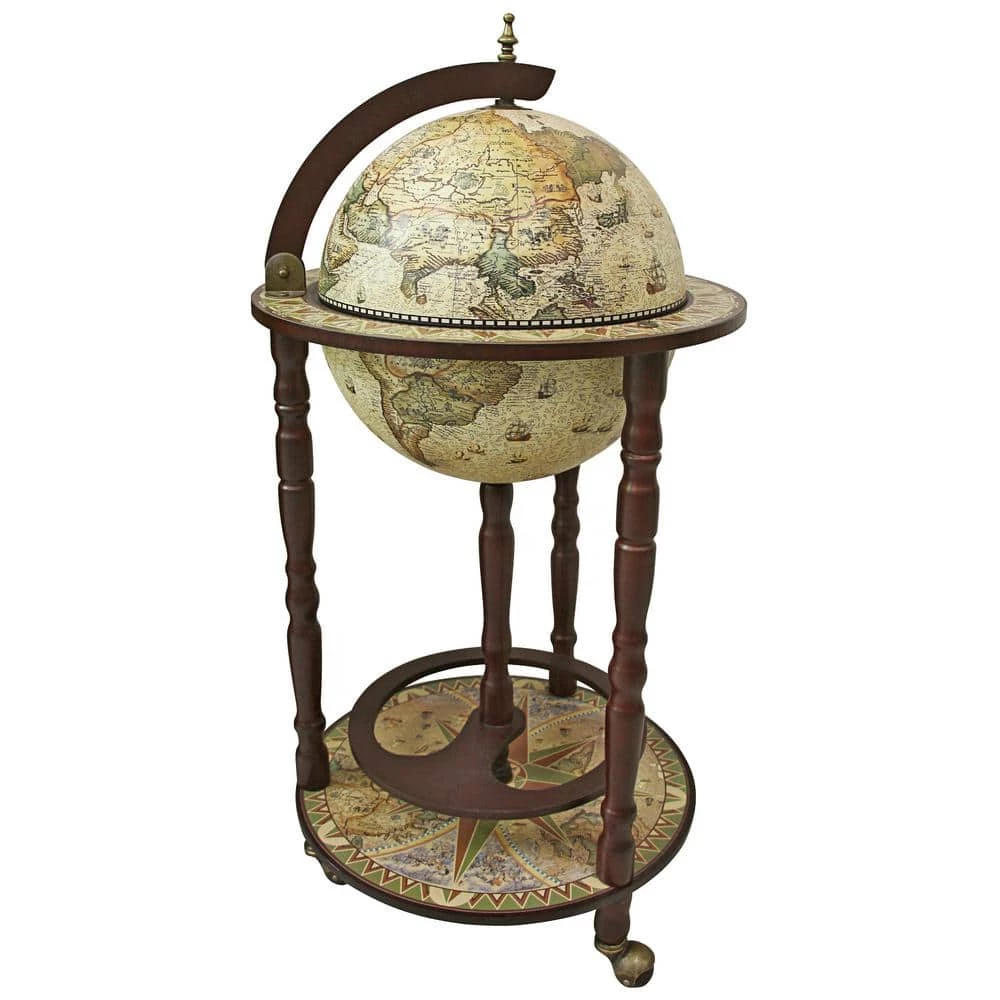 You’ll have the world at your fingertips while serving cocktails from this elegant, 13″dia. Italian-style globe bar wrapped in replica 16th century ancient nautical maps from the National Museum of Science, Florence. Say cheers to welcome guests with the Old World charm of a uniquely functional work of art. This sure-fire conversation piece opens from a hinged meridian to reveal artistic interior frescoes reminiscent of domed ceiling contraspecto (“view from the heavens”). A trio of handsome, turned hardwood legs rises from rolling casters and a circular lower shelf, allowing additional storage that happily wheels from spot to spot. Our Toscano exclusive even includes secure spots to show off your treasured decanter bottles and collectible liquor and barware. Simple assembly required. 17.5″Wx17.5″Dx34.5″H. 12 lbs.
