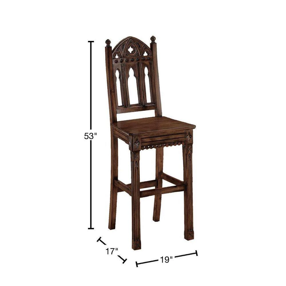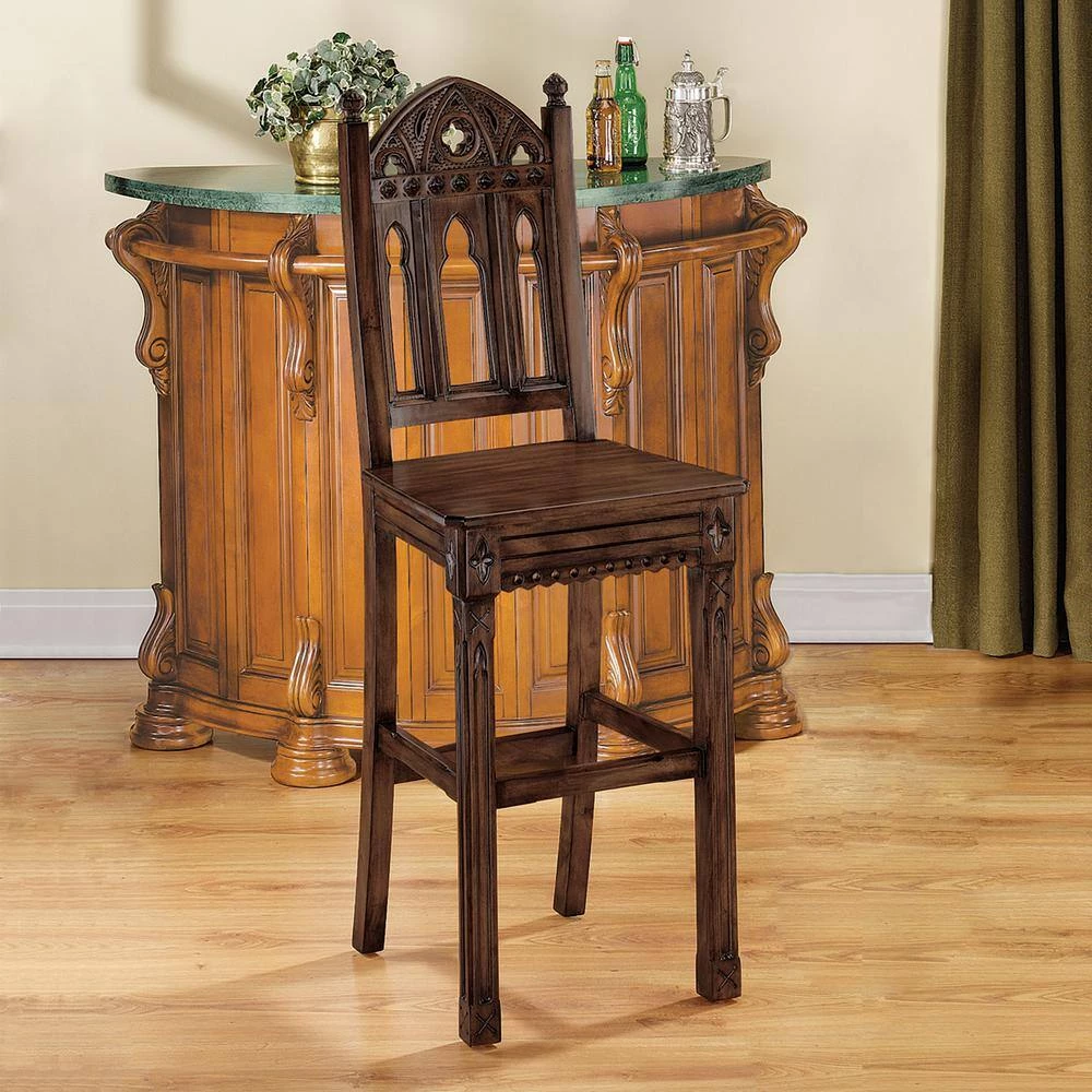 Feel like royalty as you relax into the wide-seated comfort of these full-back barstools created exclusively for Design Toscano. You ll admire our dark mahogany-finished, hand-carved works for their quality hardwood construction as well as for their high Gothic-style charm. Modeled after English cathedral architecture, these hand-finished works of furniture art add an elegant reverence to any setting. 19 in. W x 17 in. D x 53 in. H. Seat: 30 in. H. 25 lbs.