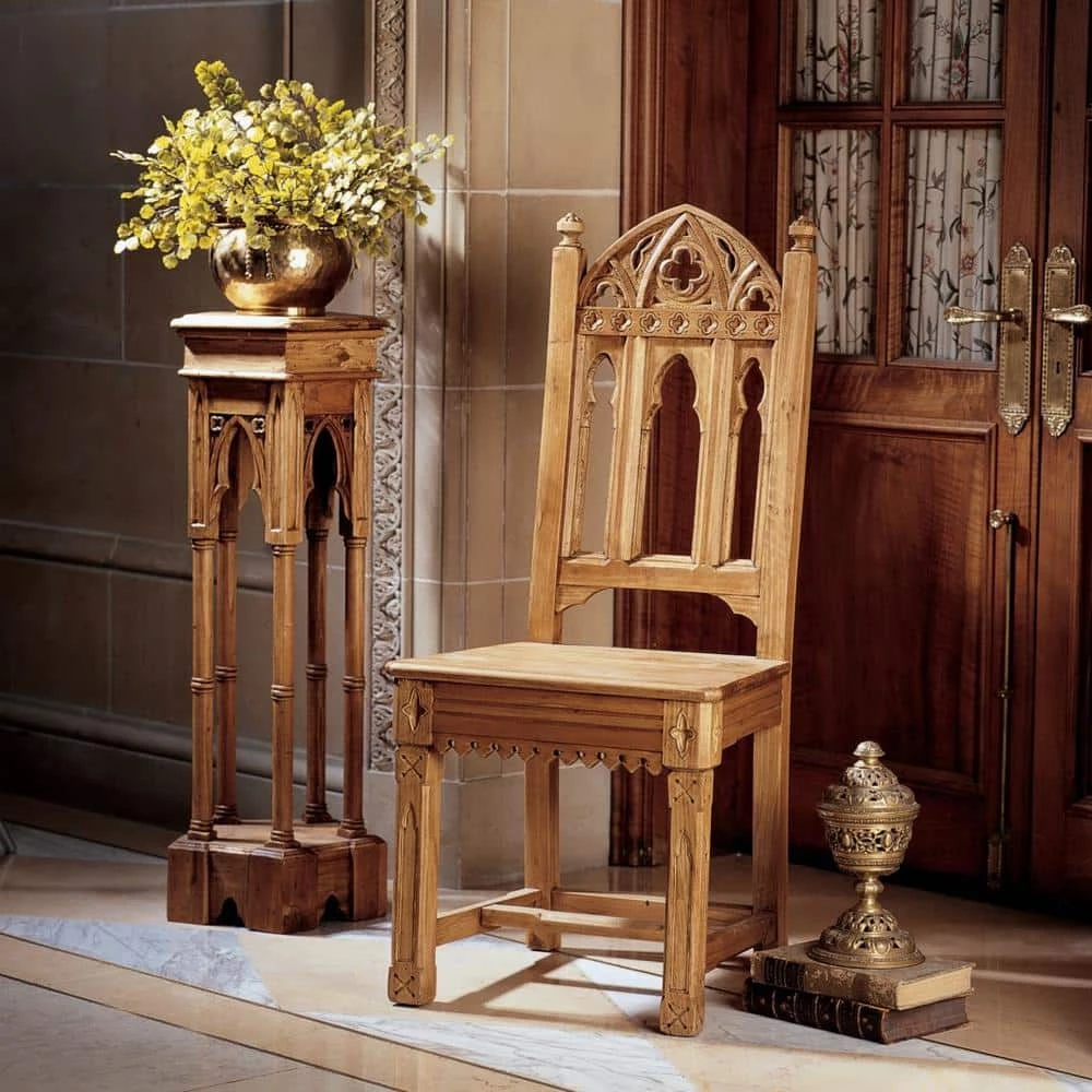 Whether you want a set for dining or a single chair simply for its architectural character, you’ll admire this hand-carved work for its quality, solid pine construction as well as its charm. Modeled after English cathedral architecture, it is rare to find such spirited Gothic design in a lighter-toned wood like this hand-waxed rich golden pine, gently distressed to appear aged. 19 in. W x 17 in. D x 42 in. H. 15 lbs.