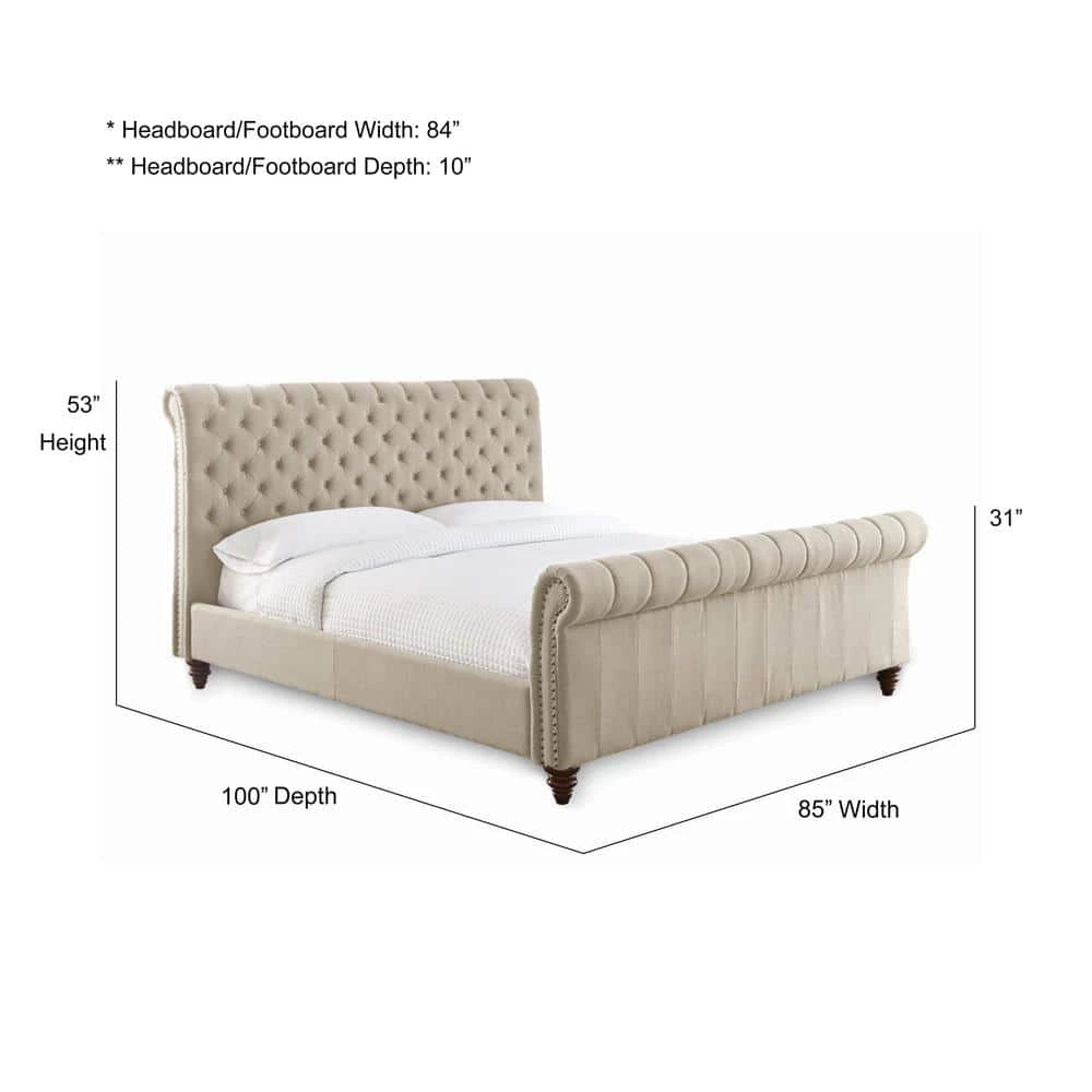 Relax in comfort with the elegant Swanson Upholstered Bed featuring a tufted headboard with nail head accents. Style is well stated in the rolled headboard and footboard and comfort is ensured with the comprehensive foundation featuring a 39 piece slat system with center supports to accomodate a box spring and mattress, or for the lower profile of a platform bed, can use a mattress only. Available in King or Queen sizes and choice of Gray or Sand upholstery.