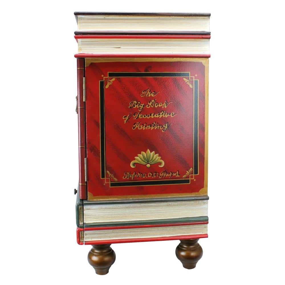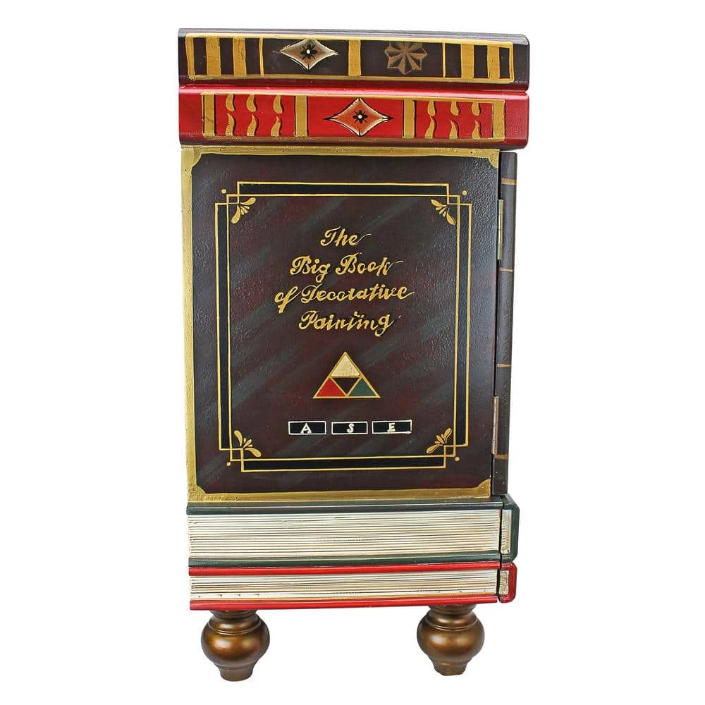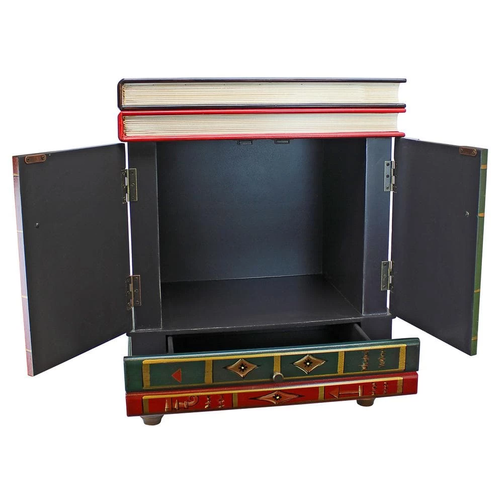 Our Toscano-exclusive trompe l’oeil side table “fools the eye” with its intricately hand-painted volumes that create a wooden work of furniture art. Faux books with authentic metal pulls slide out to reveal a single drawer, while others open as double doors for convenient storage near a favorite chair or in an entryway. This clever addition to any room is truly part fun and part function that’s perfect for the most avid bibliophile. Simple assembly required. 22 in. W x 14 in. D x 28 in. H 48 lbs.