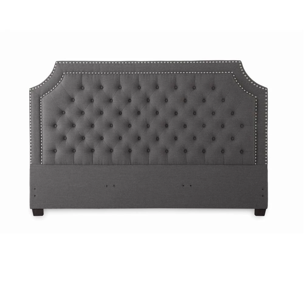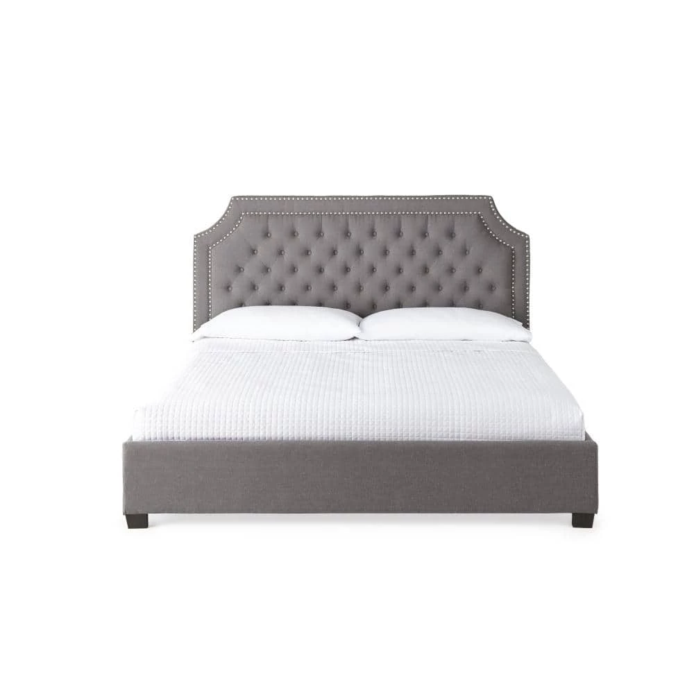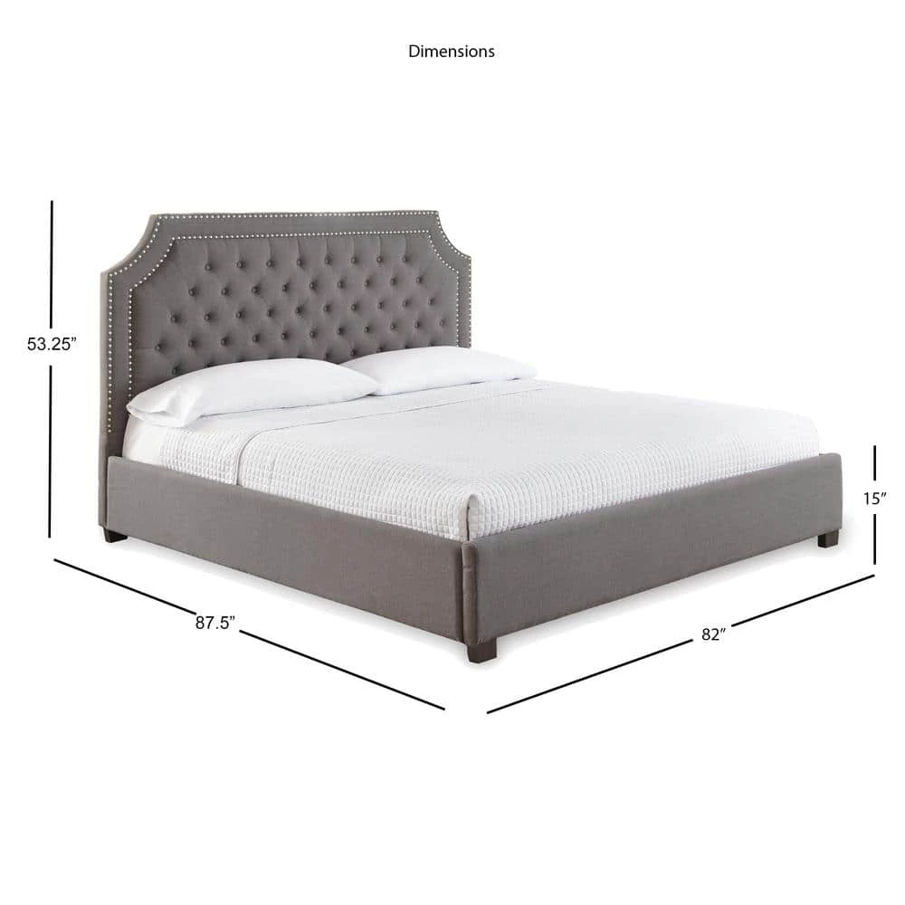 The Wilshire Upholstered Bed offers transitional styling in a bed that is as stylish and well tailored. The headboard features button tufting with silver nail head trim and rounded inset corners accented by the low profile footboard and side rails. Upholstered in a beautiful gray fabric that is easy to clean and will blend well with many existing decors and color palettes. A complete slat package is included so you can use as a platform bed or with a traditional box spring and mattress. Available in King or Queen sizes.